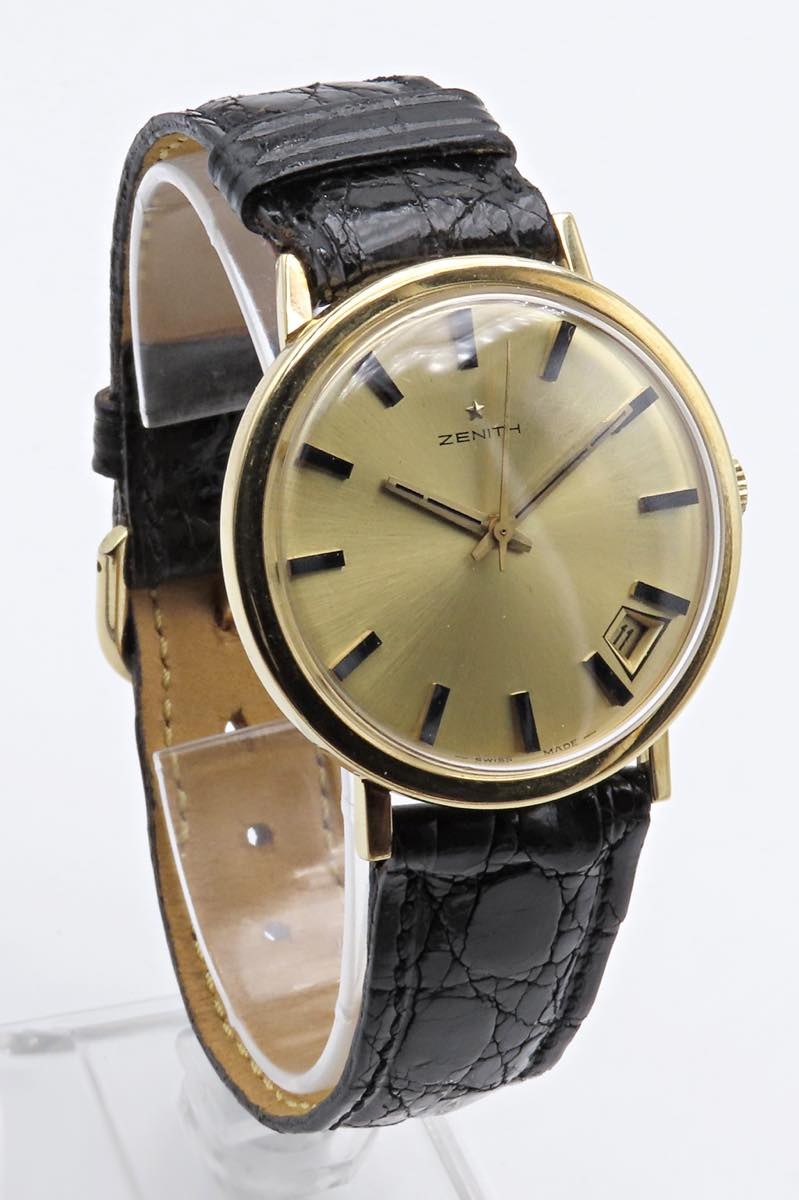 ZENITH- Solo tempo - Movimento a carica manuale. Cassa in oro 18kt con diametro da 36 mm. Dial champagne con ore, minuti e secondi al centro. Vetro plexiglas. Cinturino e fibbia non originali. Fondello in oro 18kt a scatto. 1970 ca. Ottime condizioni generali. Al momento della catalogazione l'orologio risulta essere funzionante, ma il movimento non è stato testato per la precisione del tempo.