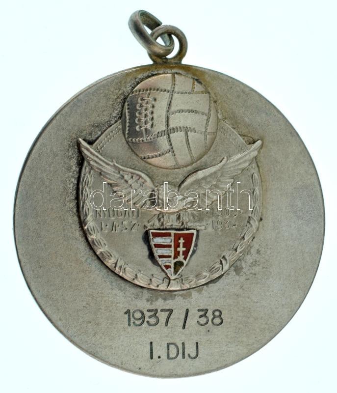1938. "Nyugatmagyarországi Labdarúgók Alszövetségének Bajnoki Érme / 1937/38 - I. díj" részben zománcozott, jelzett Ag díjérem füllel, mellszalag nélkül, "BGY" gyártói jellel (40mm/0.900/36,89g). A Nyugati alszövetség I. osztályú bajnokságát a Tatabányai SC nyerte meg. Az 1937-1938-as szezonban még területi alapon szerepeltek az NB I. alatt induló csapatok. A Bányász az országos szinten másodosztálynak számító Nyugati alszövetség I. osztályában szerepelt, melyet története során már nyolcadszor nyert meg, kettő ponttal megelőzve a Soproni FAC (SFAC) csapatát. A Nyugat bajnokaként a Bányász elindulhatott az Országos Vidéki Bajnokság egyenes kieséses rendszerében, amelynek győztese feljutott az NB I-be. A kék-fehérek a negyeddöntőben a Mezőtúrt ejtették ki 4-2-es összesítéssel, az elődöntőben pedig az akkor még vidéki településnek számító Rákoskeresztúr csapatát győzték le. A döntőben az első mérkőzést a Tatabánya 1-0-ra megnyerte a Salgótarján SE ellen (ami nem tévesztendő össze az SBTC-vel), ám a visszavágót 3-1-re a tarjániak nyerték, így ők jutottak fel az élvonalba. Azonban a Tatabánya is vigasztalódhatott: a következő szezontól az NB I. alatt bevezették a B-osztályt Keleti és Nyugati csoportra osztva, ahol a Tatabánya (és a SFAC) is indulhatott. A Nyugati alszövetség I. osztálya ettől az idénytől a harmadik ligának számított. A Tatabánya egyébként a Nyugati alszövetség meghatározó csapatának számított ezekben az időkben, 1938-ig lejátszott 23 idényéből 18 alkalommal is érmet szerzett. Az élvonalba viszont csak 1948-ban jutott fel először a csapat, s egy idény után búcsúzott is. 1956 és 1992 között viszont folyamatosan az NB I-ben szerepelt a Bányász, többször kijutott a nemzetközi porondra is, ahol több neves csapatot is legyőzött, mint pl. a Real Madrid, az Ajax, a Kaiserslautern, a Dinamo Zagreb, a Bologna, vagy a Stuttgart. Ám a 92-es kiesés után már csak két rövid időszakot töltöttek el a legjobbak között: 1999-2001 között kettő, illetve 2005-2008 között három szezont. Jelenleg az NB III-ban szerepelnek. T:AU / 1938. "Nyugatmagyarországi Labdarúgók Alszövetségének Bajnoki Érme / 1937/38 - I. díj (Championship Medal of the West Hungarian Football Association / 1937/38 - 1st prize)" partially enameled, hallmarked Ag award medal with ear, without ribbon, with "BGY" maker's mark (40mm/0.900/36,89g). The 1st class championship of the West Hungarian Football Association was won by Tatabányai SC. In the 1937-1938 season, teams competing under NB I were still playing on a regional basis. Bányász played in the 1st division of the Western Sub-Association, which was considered the second division at the national level, and won it for the eighth time in its history, two points ahead of the Soproni FAC (SFAC). As the champion of the West, Bányász could participate in the straight-elimination system of the National Countryside Championship, the winner of which advanced to NB I. The blue-whites eliminated Mezőtúr in the quarter-finals with a 4-2 aggregate score, and in the semi-finals they defeated the team from Rákoskeresztúr, which was still considered a rural settlement at the time. In the final, Tatabánya won the first match 1-0 against Salgótarján SE (not to be confused with SBTC), but the SSE won the second match 3-1, thus advancing to the top division. However, Tatabánya could also take solace: from the following season, the B-division was introduced under the NB I., divided into Eastern and Western groups, in which Tatabánya (and SFAC) also participated. The Western Sub-Association's 1st division was considered the third league from this season. The Tatabánya was considered the dominant team of the Western Sub-Association in those times, won medals 18 times out of the 23 seasons it played until 1938. However, the team only reached the top division for the first time in 1948, and was relegated after one season. Between 1956 and 1992, Bányász played continuously in the NB I, and also made it to the international stage several times, where they defeated several famous teams, such as Real Madrid, Ajax, Kaiserslautern, Dinamo Zagreb, Bologna, or Stuttgart. However, after the relegation in 1992, they only spent two short periods in the 1st division: two seasons between 1999-2001 and three seasons between 2005-2008. They currently play in the 3rd league (NB III). C:AU