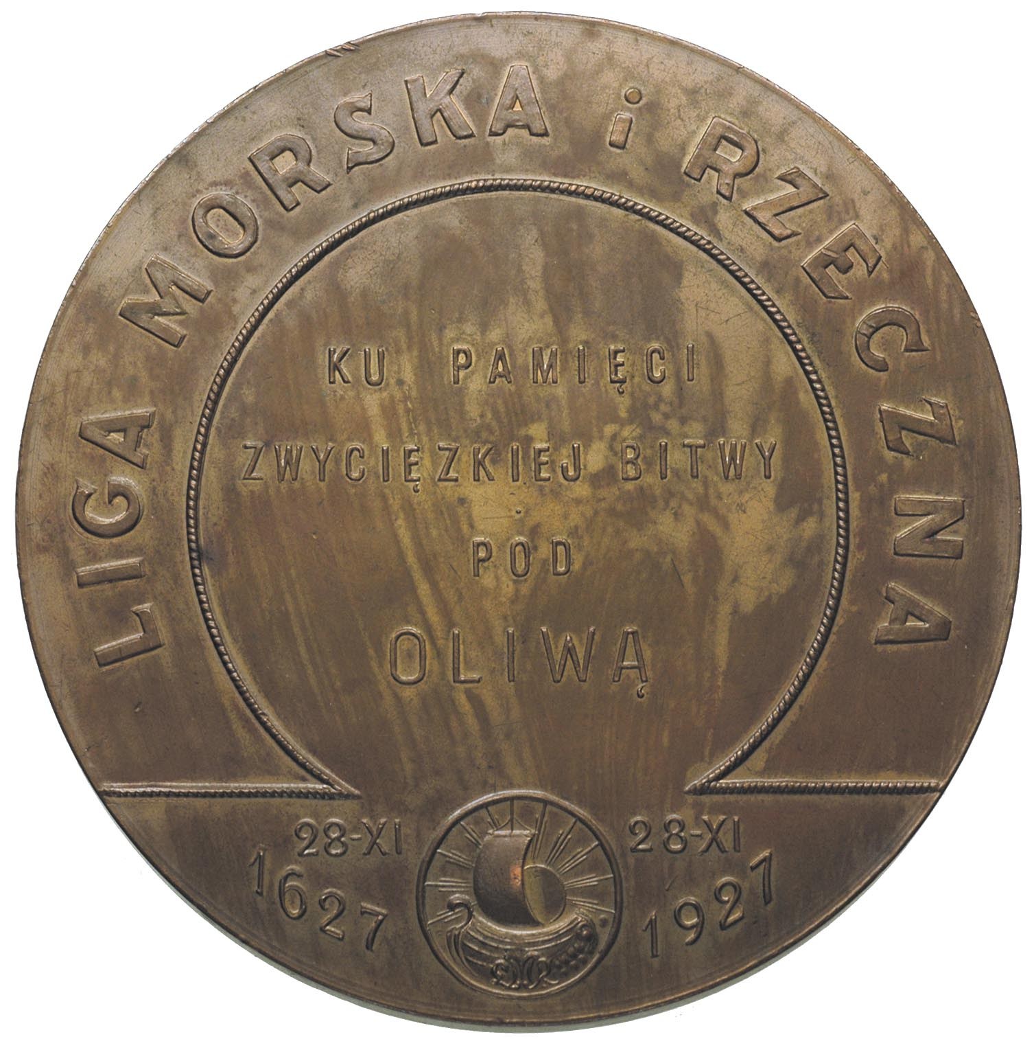 POLSKA, 300-lecie Bitwy pod Oliwą- medal autorstwa Stefana Ślezaka 1927 r., Aw: W otoku napis LIGA MORSKA I RZECZNA, poziomo KU PAMIĘCI ZWYCIĘZKIEJ BITWY POD OLIWĄ 28.XI.1627 - 28.XI.1927, Rw: Dwa walczące żaglowce, brąz 329.78 g, 94 mm, Strzałkowski 576 RR, rzadki