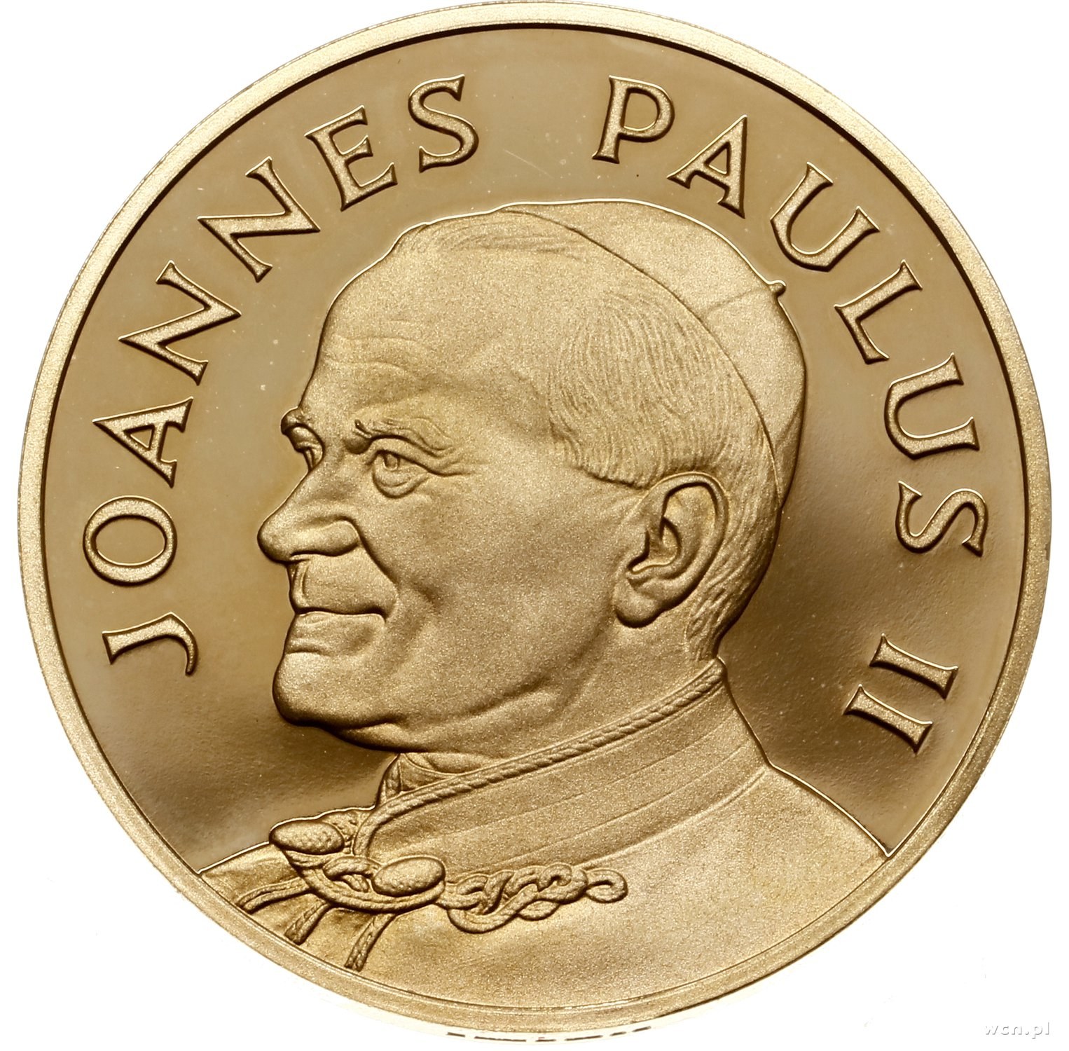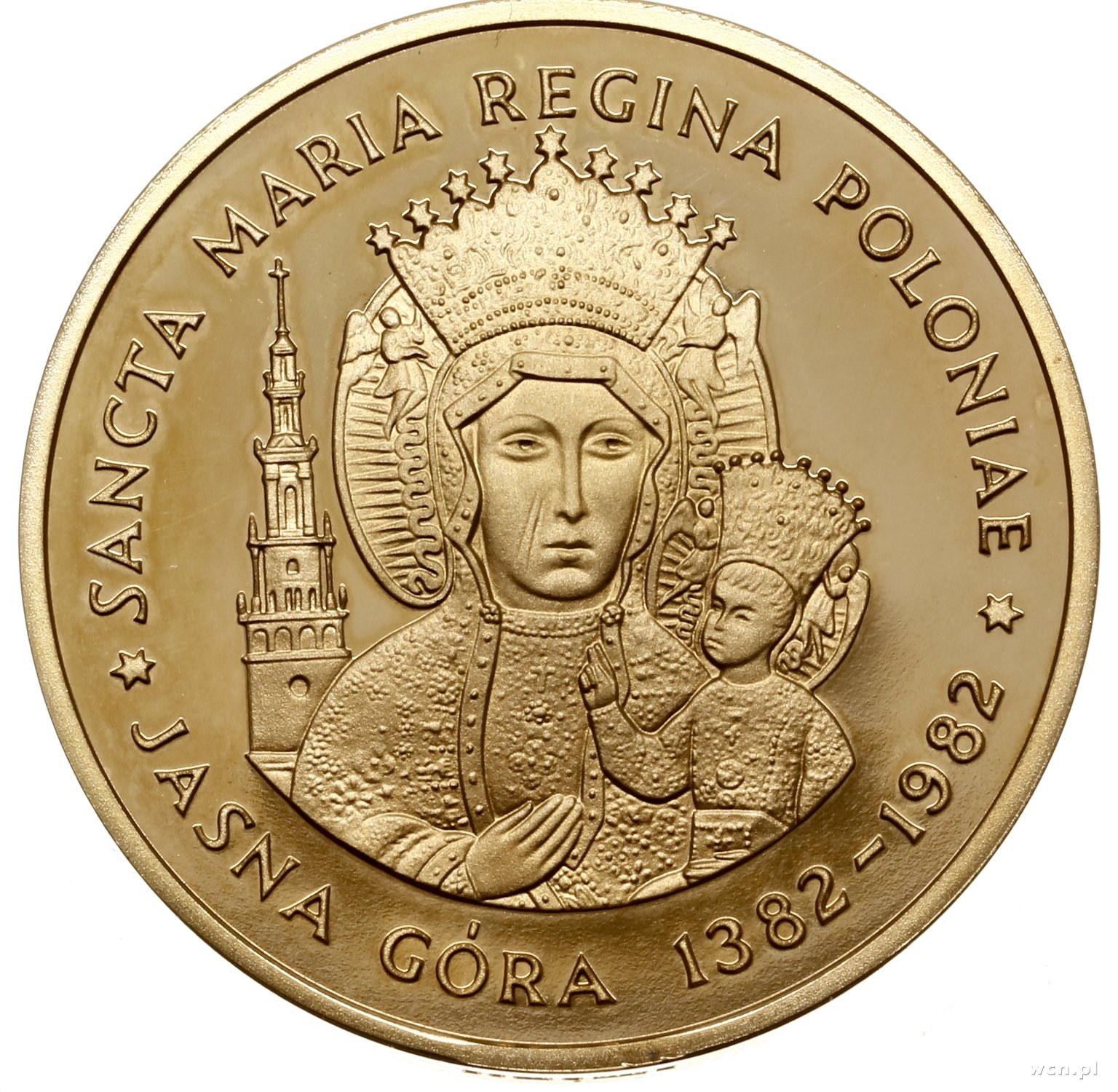Medale Polonii po II wojnie światowej, 600 lat fundacji klasztoru na Jasnej Górze, 1982, projektu Michaela Rizello, Londyn; Aw: Popiersie Jana Pawła II w lewo, JOANNES PAULUS II; Rw: Matka Boska Częstochowska, z lewej wieża klasztoru jasnogórskiego, SANCTA MARIA REGINA POLONIAE - JASNA GÓRA 1382–1982; na obrzeżu punce złota; Grabowski 0267; złoto, 35.1 mm, 33.93 g; drobne ryski w tle, bity stemplami lustrzanymi, medal w oryginalnym pudełku Royal Mint wraz z certyfikatem, nakład 10.000 sztuk.