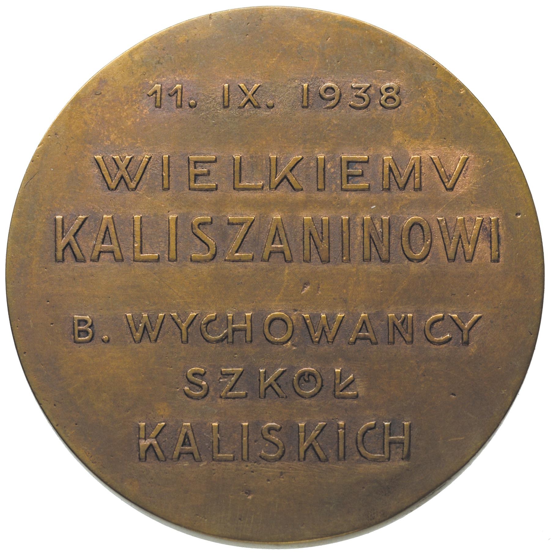 POLSKA, Adam Asnyk - medal wybity na stulecie urodzin 1938 r., Aw: Popiersie en face w kwadracie, z boków kwadratu napis ADAM ASNYK 11.IX 1838 - 2.VIII.1897, Rw: Napis w sześciu wierszach 11.IX.1938 WIELKIEMU KALISZANINOWI B. WYCHOWAŃCY SZKÓŁ KALISKICH, brąz 56 mmm, Strzałkowski 842 RR, rzadki