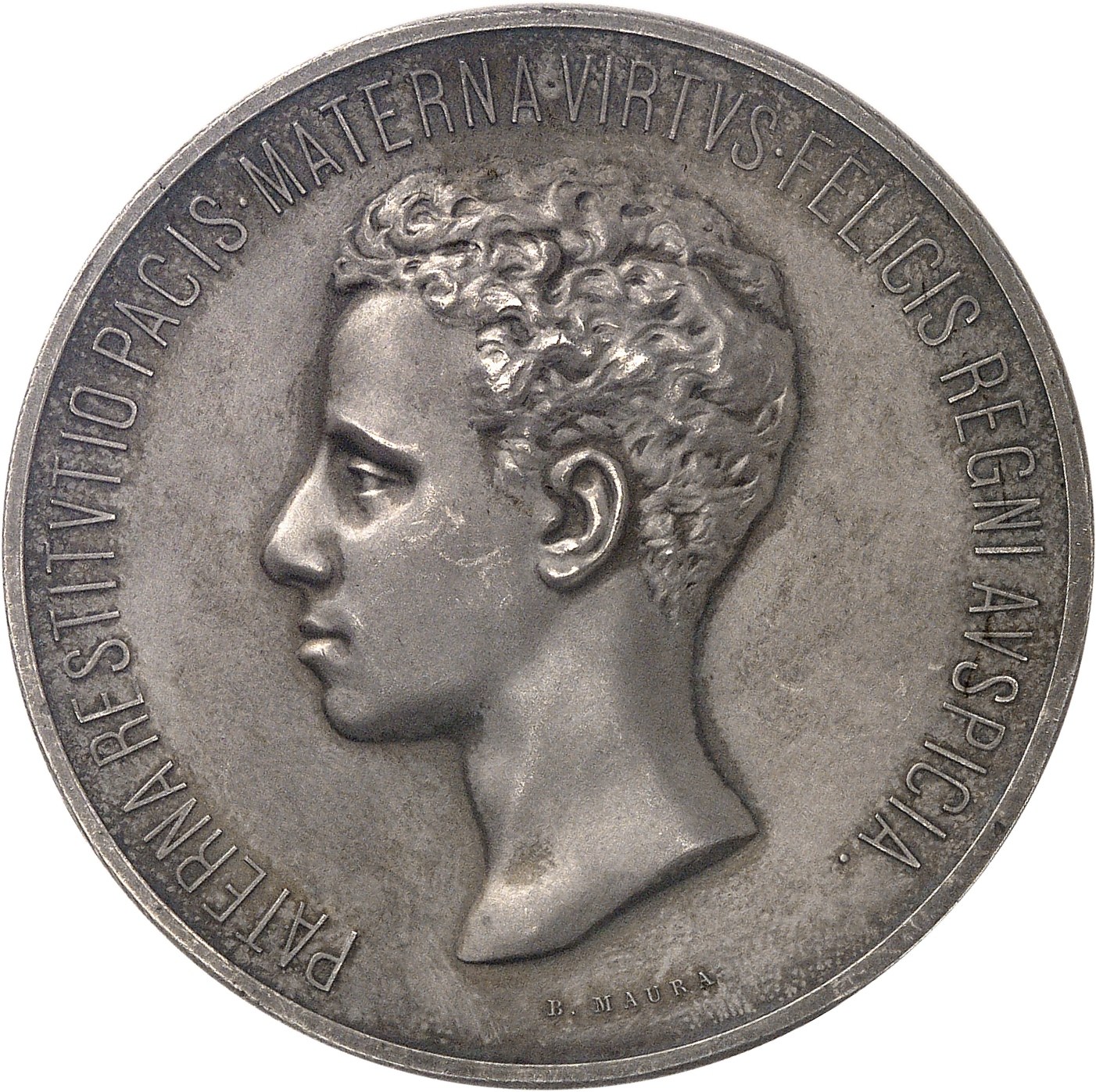 Av. PATERNA RESTITVTO PACIS. MATERNA VIRTVS. FELICIS REGNI AVSPICIA. Tête nue du Roi à gauche ; signature B. MAURA.