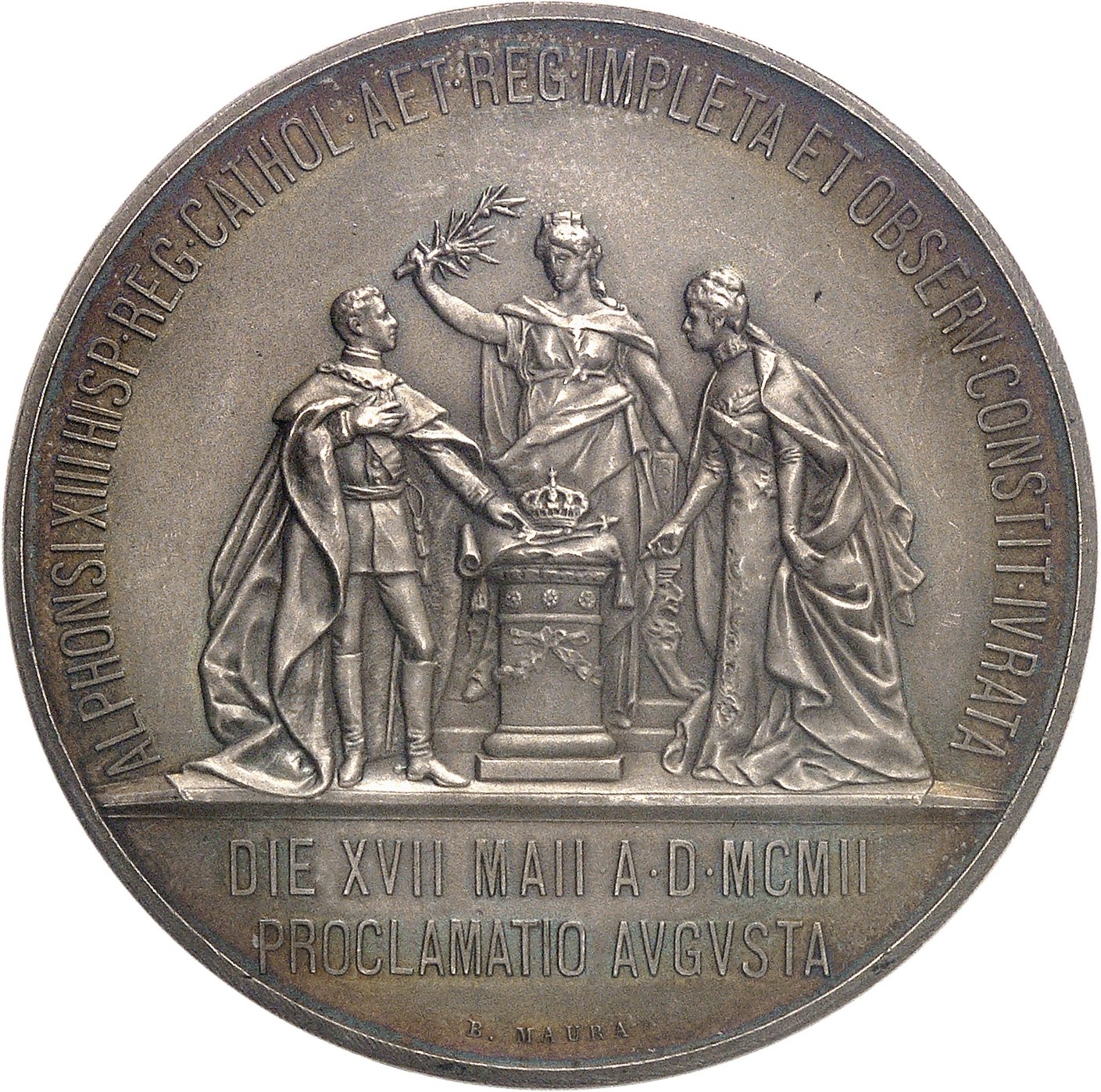 Rv. ALPHONSI XIII HISP. REG. CATHOL. AET. REG. IMPLETA ET OBSERV. CONSTIT. IVRATA. Autour d’un autel avec les attributs royaux, le Roi et la Reine et l’Espagne tourelée avec une branche d’olivier ; à l’exergue : DIE XVII MAII A. D. MCMII PROCLAMATIO AVGVSTA et signature B. MAURA.