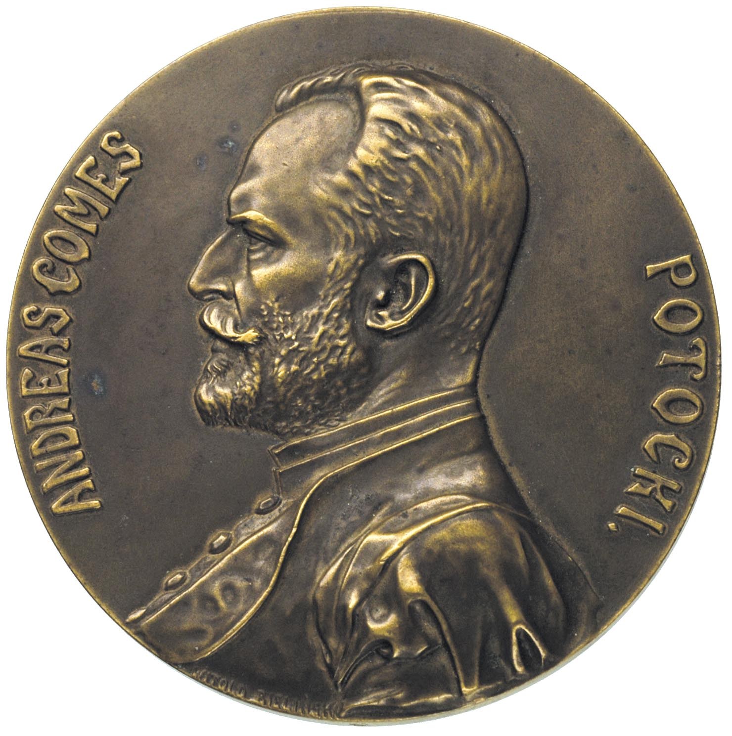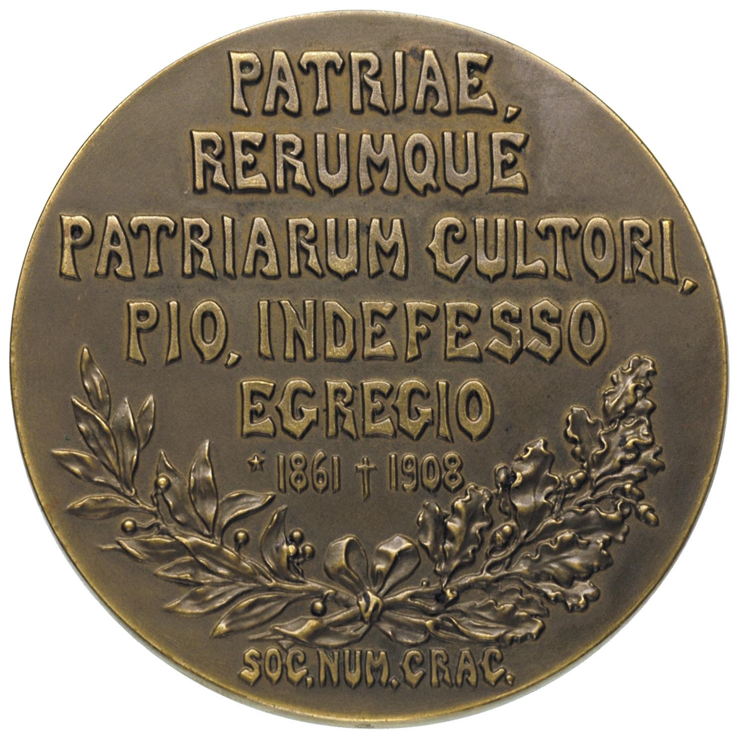 POLSKA, Andrzej Potocki-medal autorstwa Witolda Bielińskiego wybity staraniem Towarzystwa Numizmatycznego w Krakowie w 1908 r., Aw: Popiersie Potockiego w lewo i napis, Rw: Gałązka laurowa i dębowa i napis PATRIAE, RERUMQUE PATRIARUM CULTORI, PIO, INDEFESSO EGREGIO, 1861-1908, poniżej napis SOC.NUM. CRAC., brąz 87.83 g, 60 mm, Strzałkowski 105 RR, wybito 50 egzemplarzy, bardzo rzadki medal