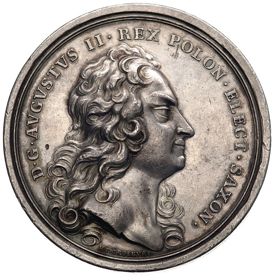 POLSKA, August II- medal autorstwa H. P. Groskurta wybity z okazji odzyskania tronu polskiego po bitwie pod Połtawą, Aw: Popiersie z długimi włosami w prawo i napis w otoku D. G. AVGVSTVS II REX POLON ELECT SAXON, Rw: Korona królewska na tle skrzyżowanych dwóch mieczy, napis u góry CVM VITA DEPONAM, H-Cz. 2708 (R2), Racz. 326, srebro 65 mm, 119.07 g, piękny styl, bardzo efektowny egzemplarz