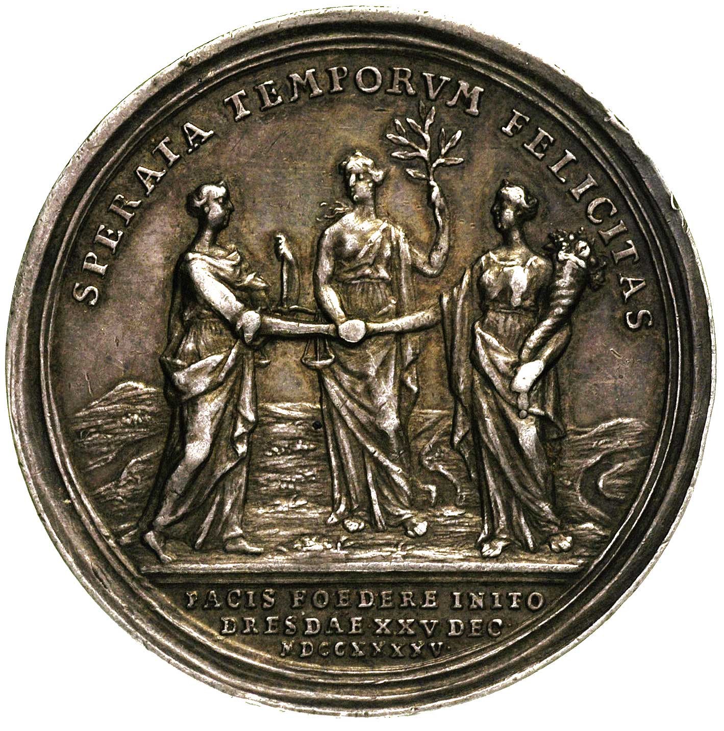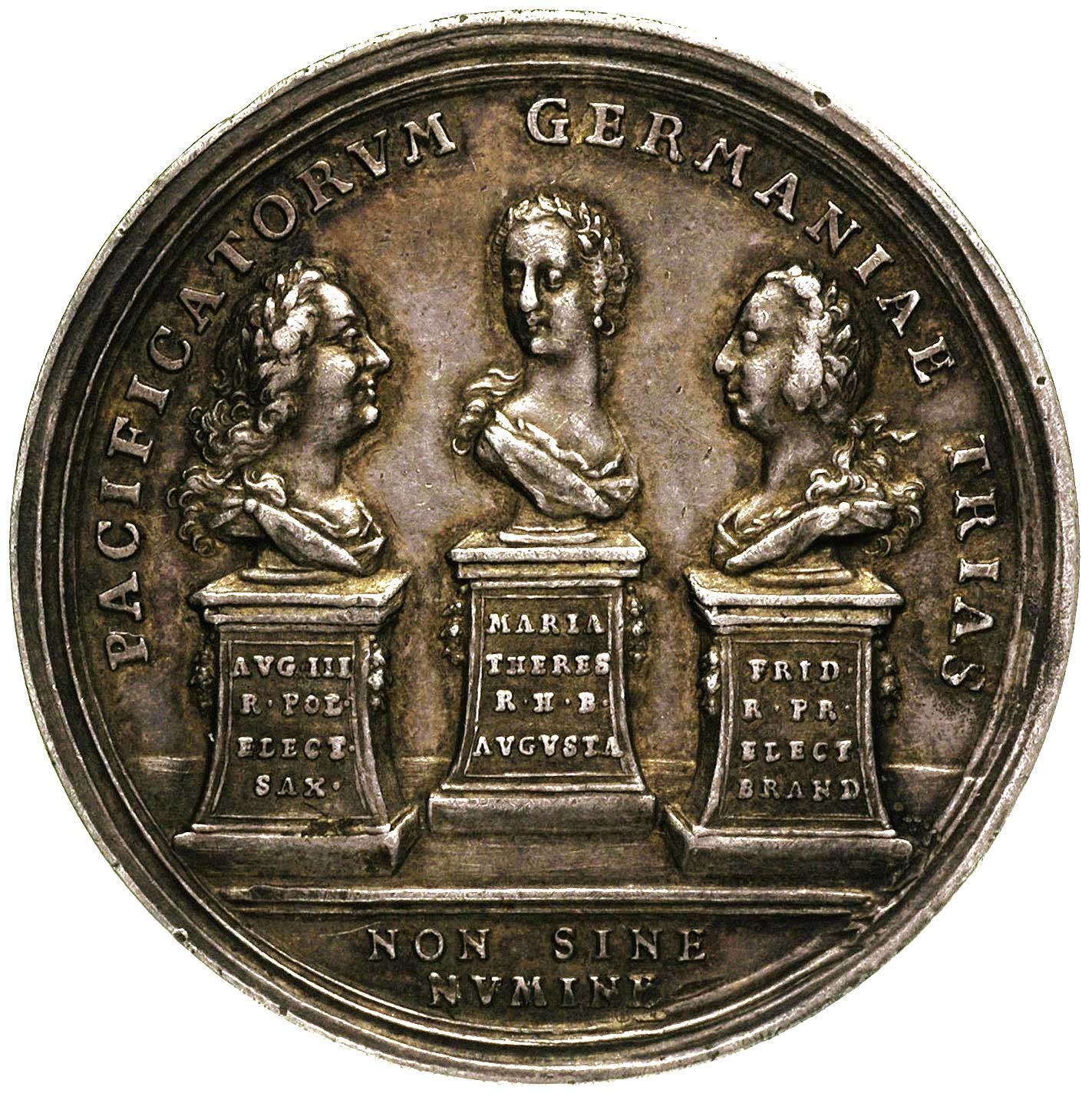 POLSKA, August III - pokój drezdeński, 1745, medal autorstwa Vestnera, Aw: Na postumentach popiersia Augusta III, Marii Teresy i Fryderyka II w otoku napis PACIFICATORVM GERMANIAE TRIAS, poniżej w odcinku NON SINE NVMINE, Rw: Trzy osoby podające sobie dłonie, jedna z nich trzyma szalę, druga gałązkę oliwną, trzecia róg obfitości, powyżej napis SPERATA TEMPORVM FELICITAS, w odcinku PACIS.... XXV DEC MDCCXXXXV, Racz. -, H-Cz. 2768 R2, srebro 44 mm, 28.92 g, rzadki, patyna