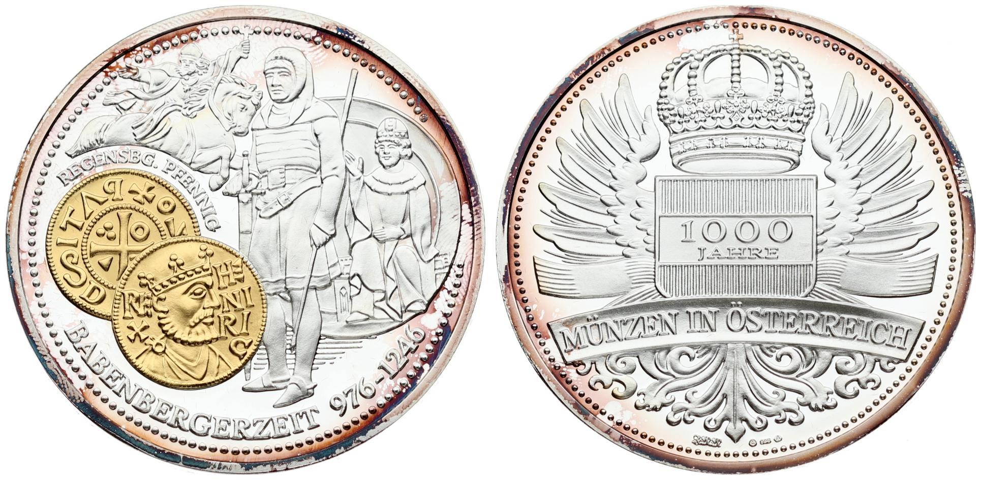 Austria Medal 1000 years of coins in Austria (2002) " Babenbergzeit 976-1246 Regensbg Pfennig". Silver. Weight approx: 50.70 g. Diameter: 50 mm.