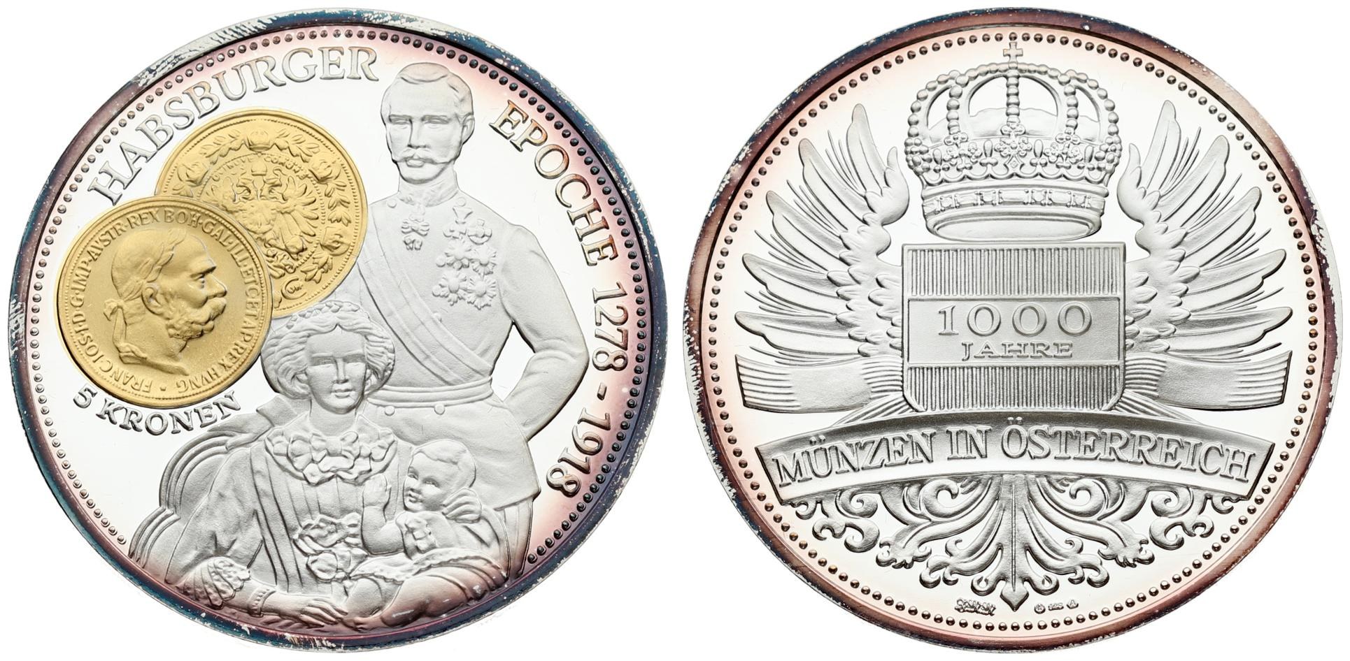 Austria Medal 1000 years of coins in Austria (2002) "Habsburg Era 1278-1918 5 Kronen". Silver. Weight approx: 50.38 g. Diameter: 50 mm.