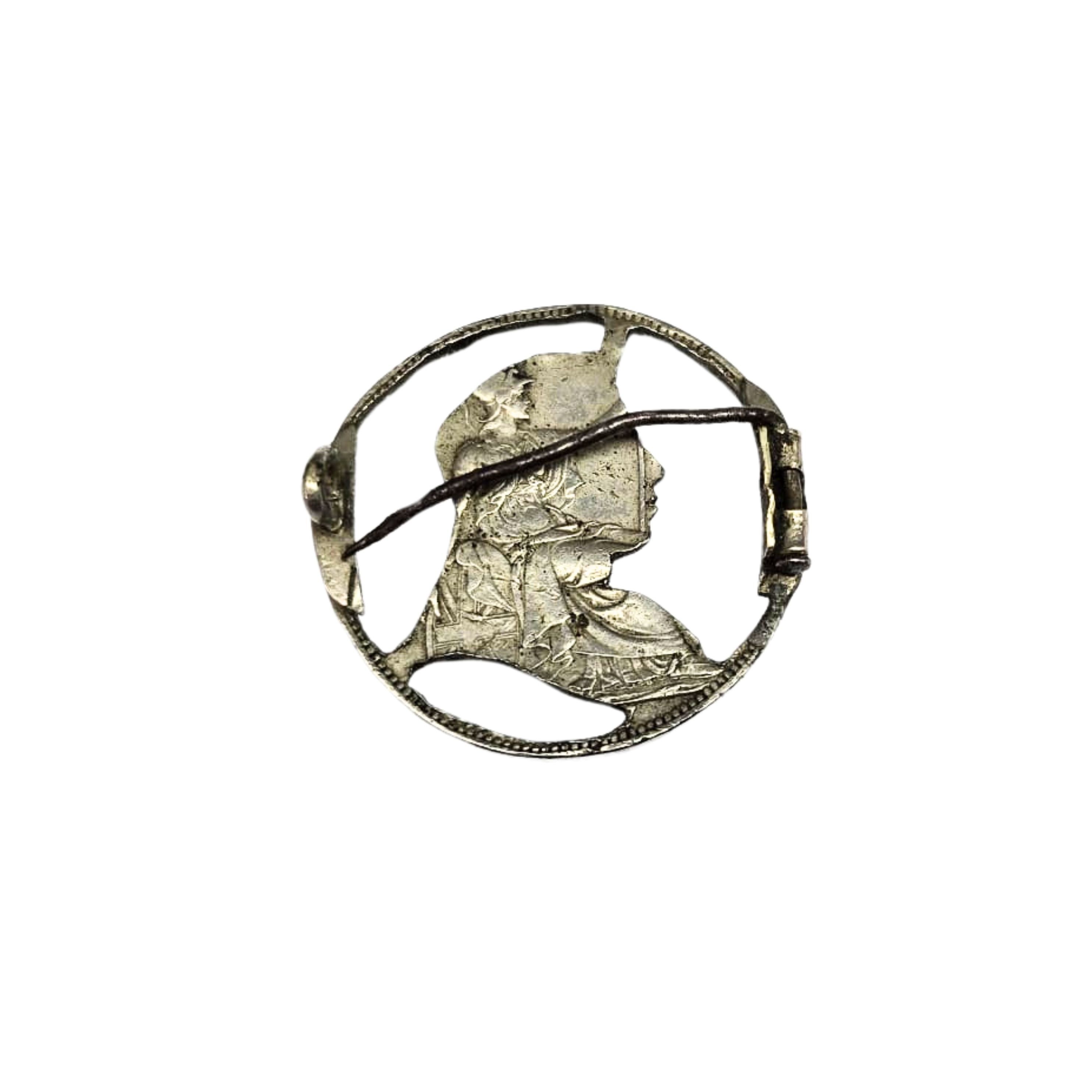 Ręcznie wykonana z broszka z Medalu Indyjskiego (przyznawanego brytyjskim i hinduskim żołnierzom za udział w kampania w Indiach w latach 1895-1902). Większość medalu została usunięta, pozostawiono jedynie wizerunek królowej Wiktorii.
