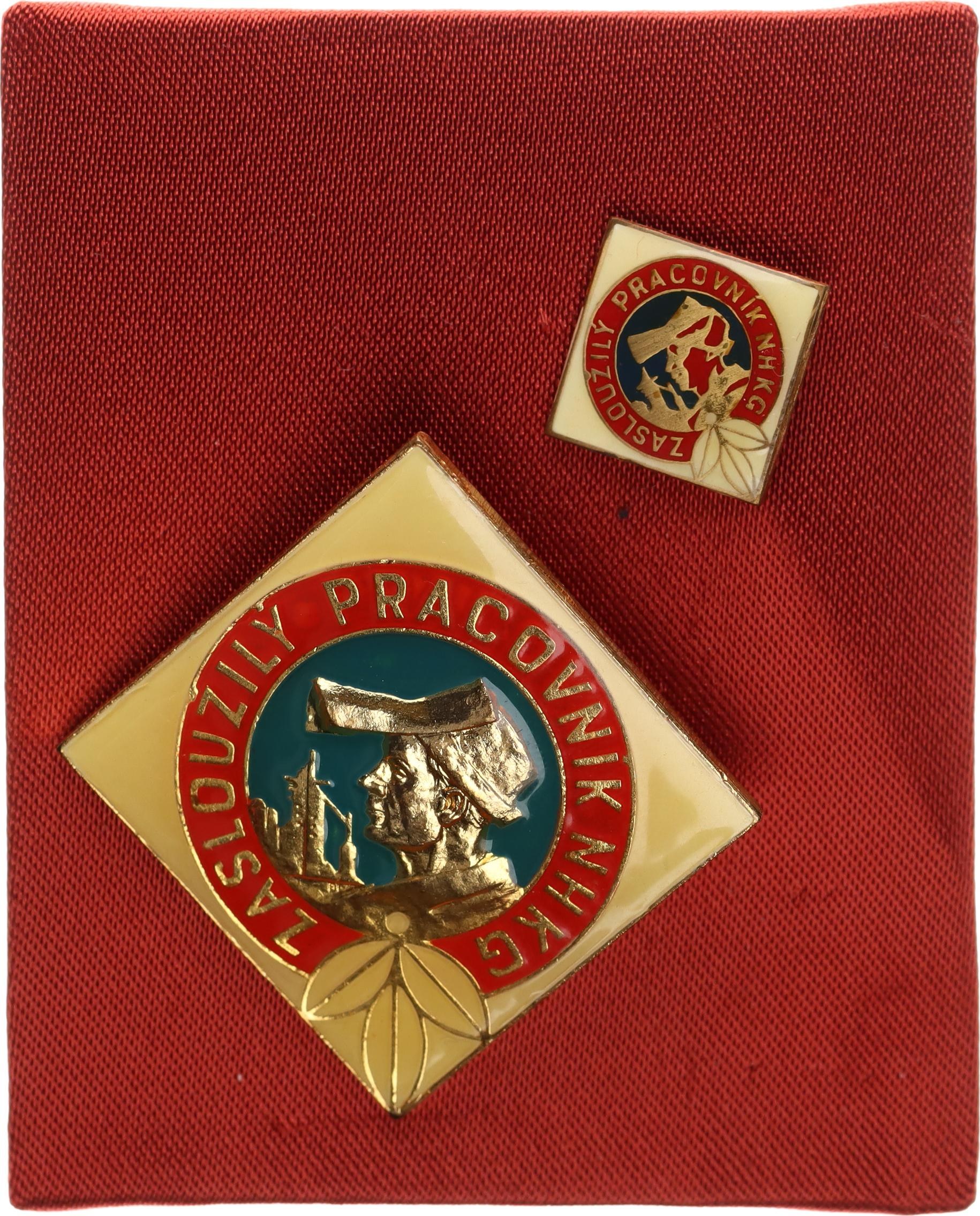 Odznak "Zasloužilý pracovník NHKG" barevný smalt kosočtverec 32, 5x32,5 mm +klopová miniatura 14,5x14,5 mm 2 ks etue
