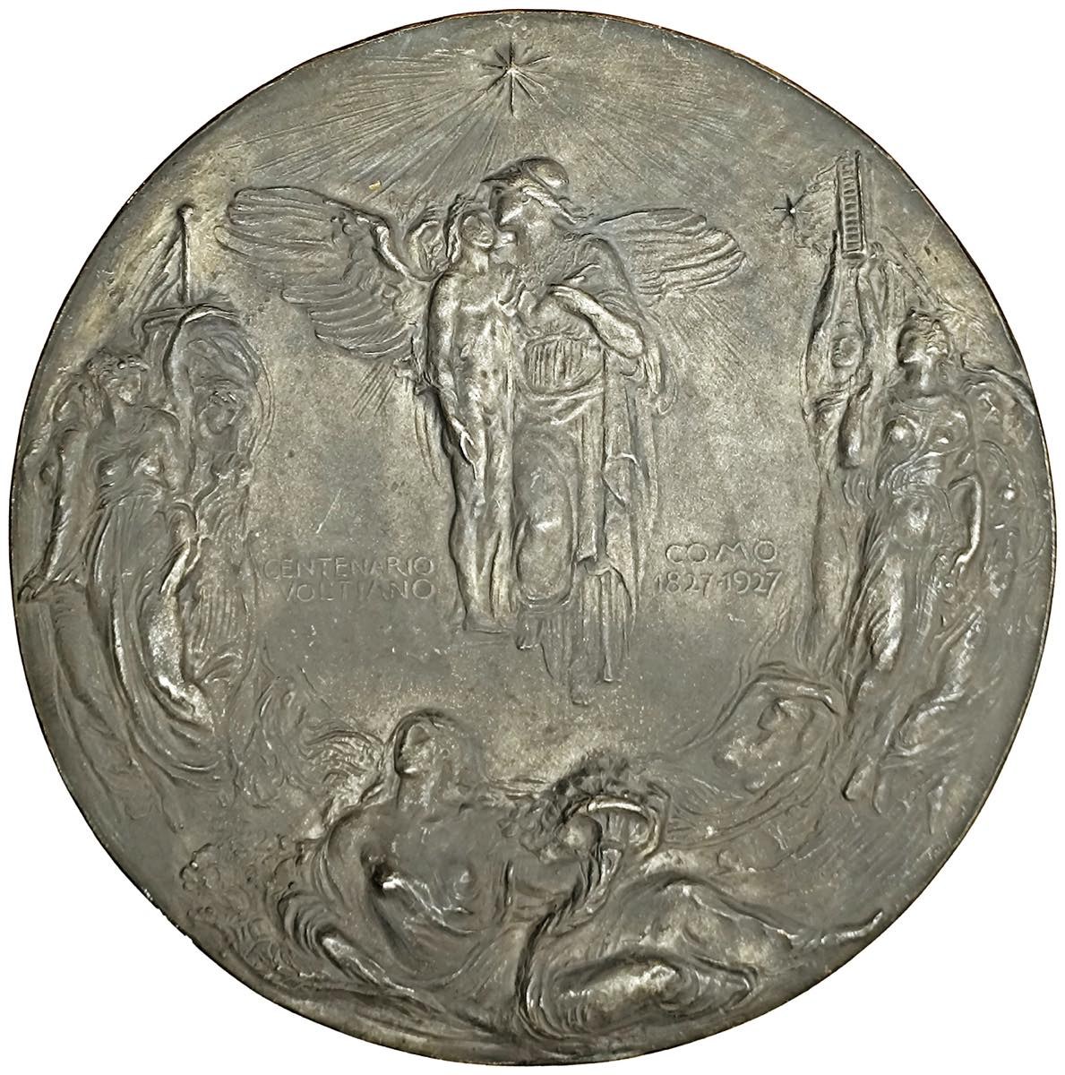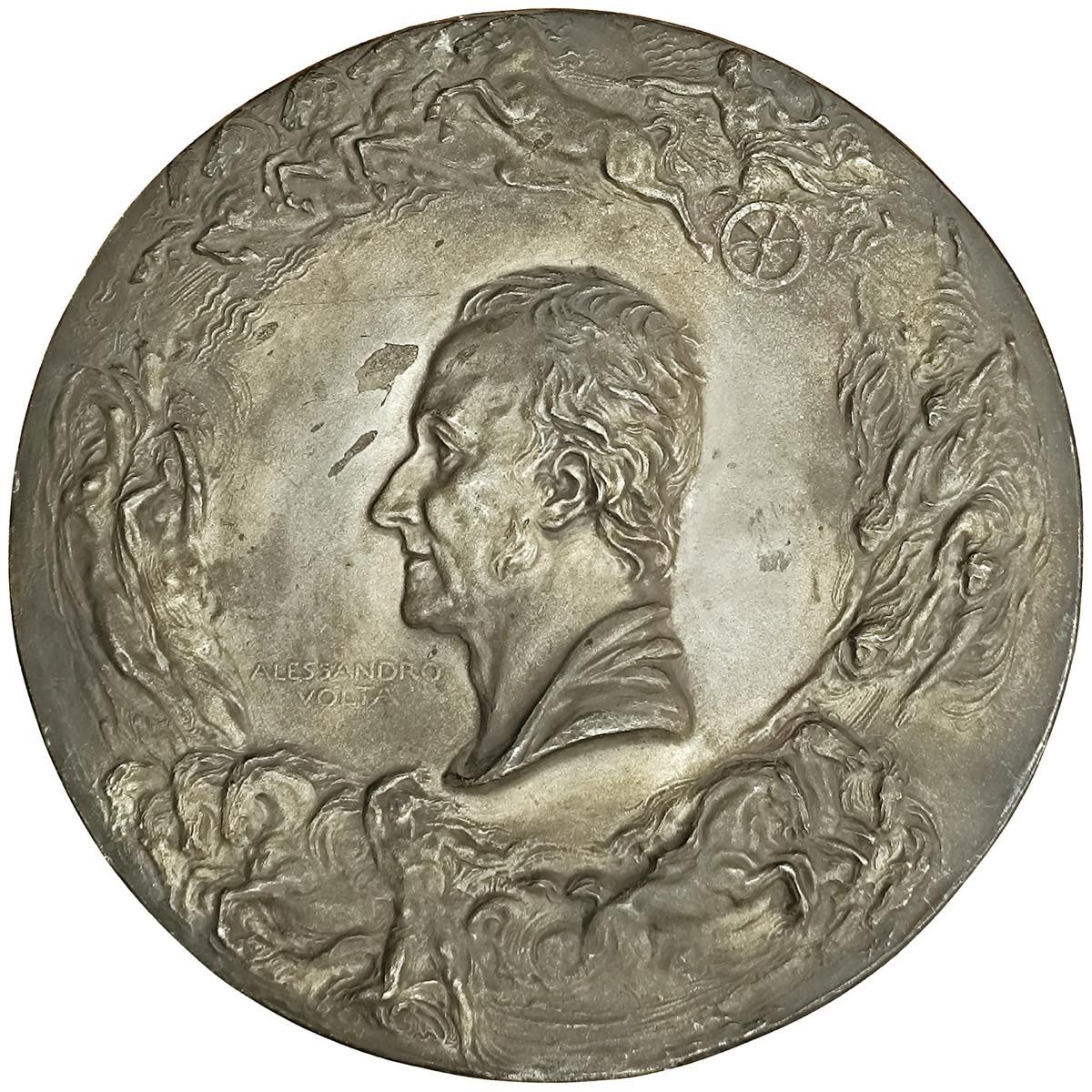 Alessandro Volta (1745-1827) Medaglia di grandissimo modulo 1927 Primo Centenario della morte - Opera prodotta dalla fusione e unione di due placche - Opus: Egidio Boninsegna modellò - F. Lorioli incise per la Lorioli e Castelli di Milano - AE fuso (g.+4000 - Ø 350 mm) Probabile esemplare da modello, di rarissima reperibilità