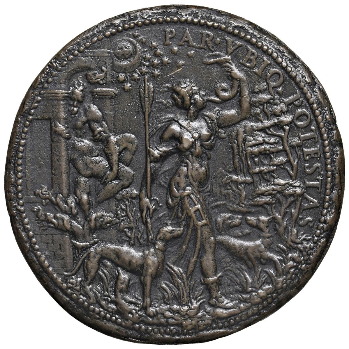 Camilla Pallavicini (1510-1557) Medaglia da fusione s.d. (metà del XVI sec.) Busto femminile della Pallavicini; Diana suona un corno accompagnata da tre cani, dietro Plutone con Cerbero ai suoi piedi - Attribuita a: Leone Leoni - Vannel & Toderi 491,1269 - AE (g 113 - Ã