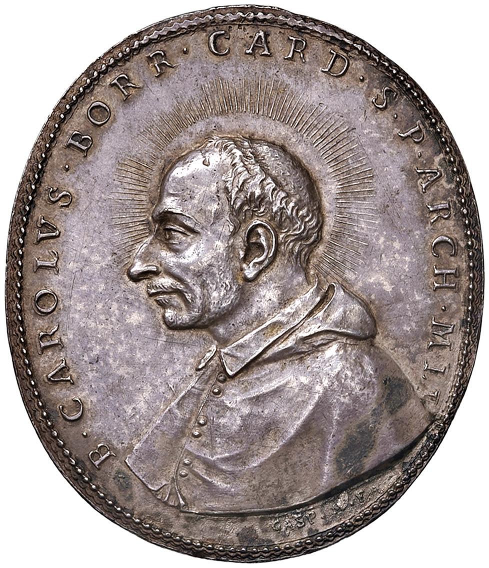 Cardinal Carlo Borromeo (1564-1584) Medaglia - Opus: Gaspare Molo - AG (g 19,85 - Ø 40 x 46 mm) RRR Una imponente e splendida medaglia con uno splendido pedigree: Ex Nomos 22 giugno 2021, ex CNG 109, 12 settembre 2018, 825, CNG 100, 7 October 2015, 2354, e Numismatica Genevensis SA 5, 3 dicembre 2008, 802 (dove ha realizzato 17.000 CHF). Nel catalogo Nomos questa medaglia è attribuita a Gasparo Cambi ma la firma sotto il busto GASP M crediamo non lasci dubbi per l’attribuzione al celeberrimo Gaspare Mola