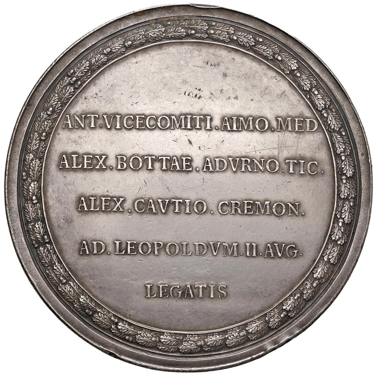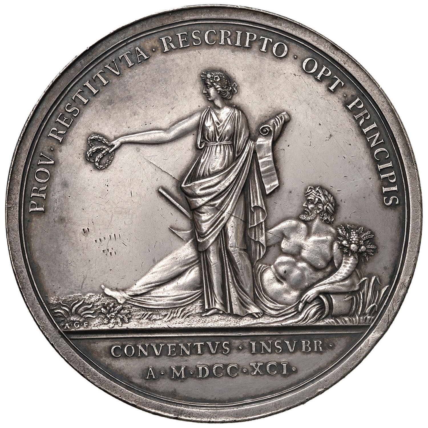 Leopoldo II d'Austria (1747-1792) Medaglia 1791 Deputazione lombarda alla corte di Leopoldo II imperatore d'Austria a Milano; La Lombardia abbigliata da antica matrona romana in piedi in prossimità del fiume Po - Opus: A.C.F. - Ex Collezione Horsky, n. 3270 - RRRR - AG (g 88,03 - Ø 62 mm) Rarissima medaglia di grande fascino e rarità