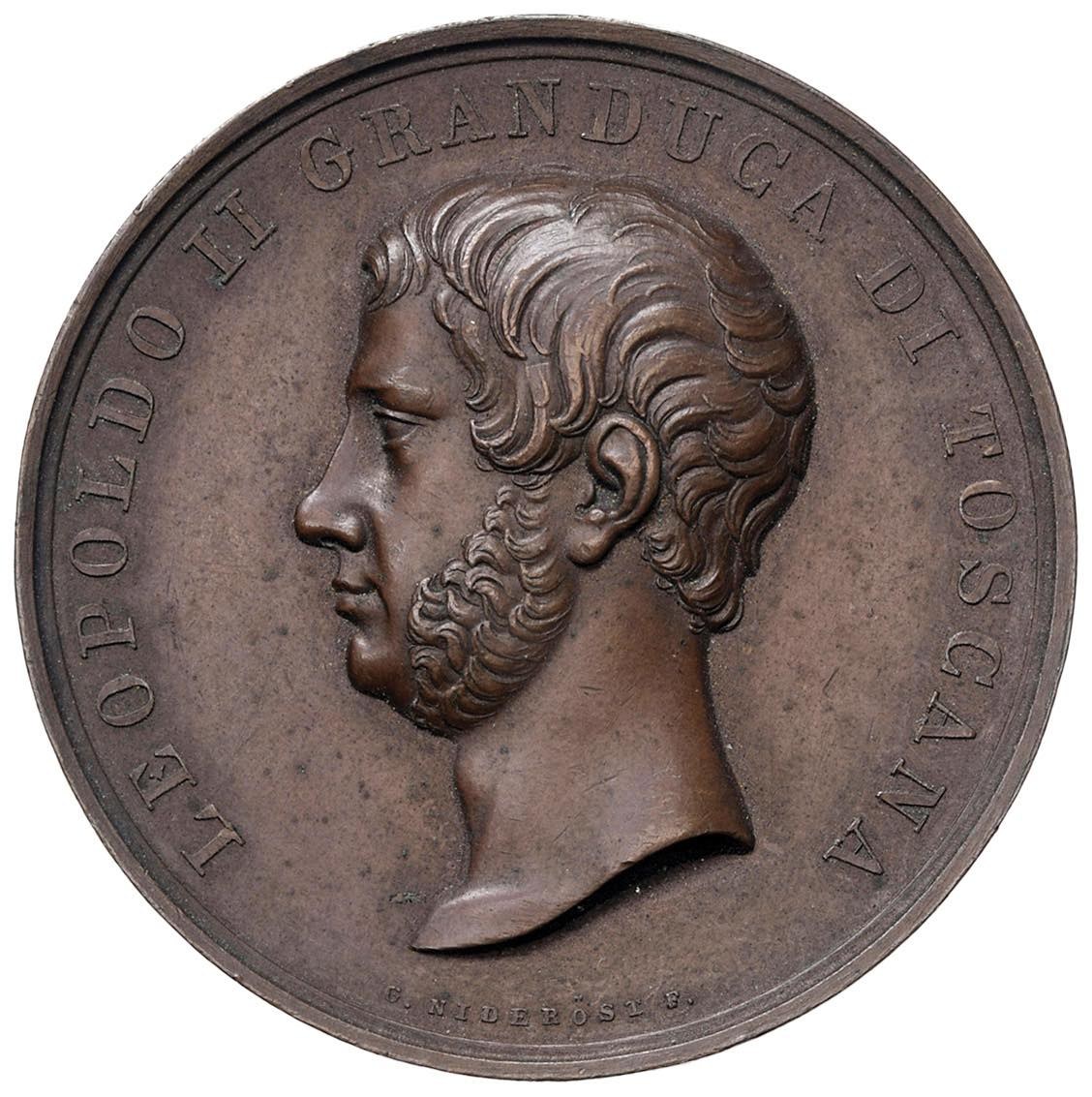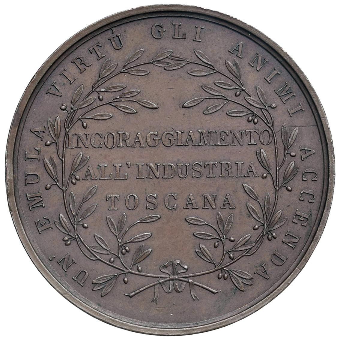 Leopoldo II Gran Ducato di Toscana (1797-1870) Medaglia premio 1850 Incoraggiamento all'industria Toscana - Bella incisione lavorata, d'epoca al bordo: AL MARCH. FERDINANDO BARTOLOMMEI DI FIRENZE L'ANNO 1850 - Opus: G. Niderost - RR - AE (g 39,41 - Ø 45 mm) Rarissima medaglia con incisione lavorata al bordo. Colpetto al bordo e segni di contatto