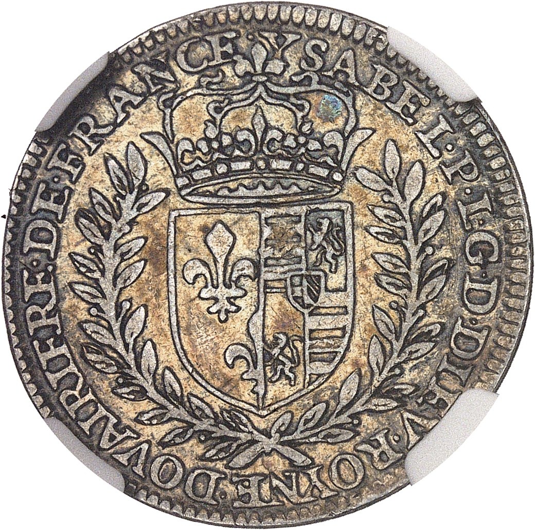 Av. YSABEL. P. L. G. D. DIEV. ROYNE. DOVAIRIERE. DE. FRANCE. Dans une couronne formée de deux branches, écu parti de France et d’Autriche couronné.
