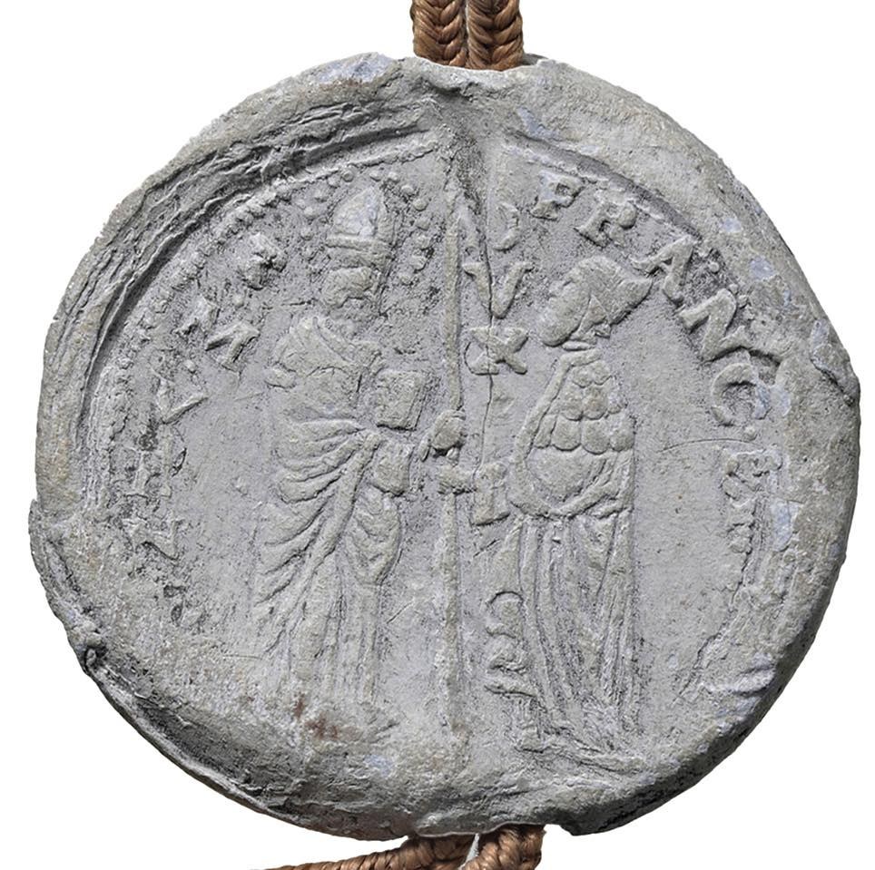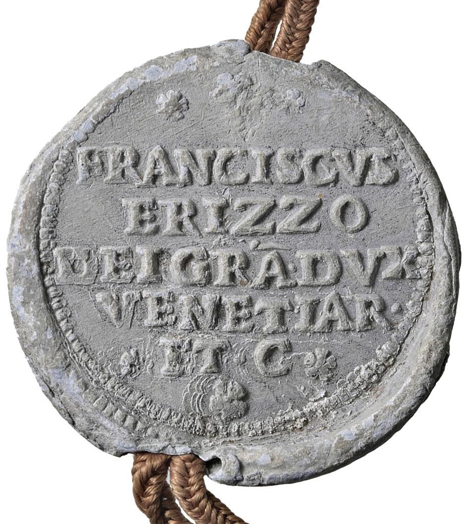 VENEZIA. Francesco Erizzo Doge XCVIII (1631-1646) Bolla plumbea, San Marco, stante verso s., tiene con la mano d. il vessillo e con la s. il Vangelo aperto; a d., il doge, regge il vessillo con entrambe le mani - R - PB (g 42,92 - Ø 38 mm) Molto rara e con suo cordoncino