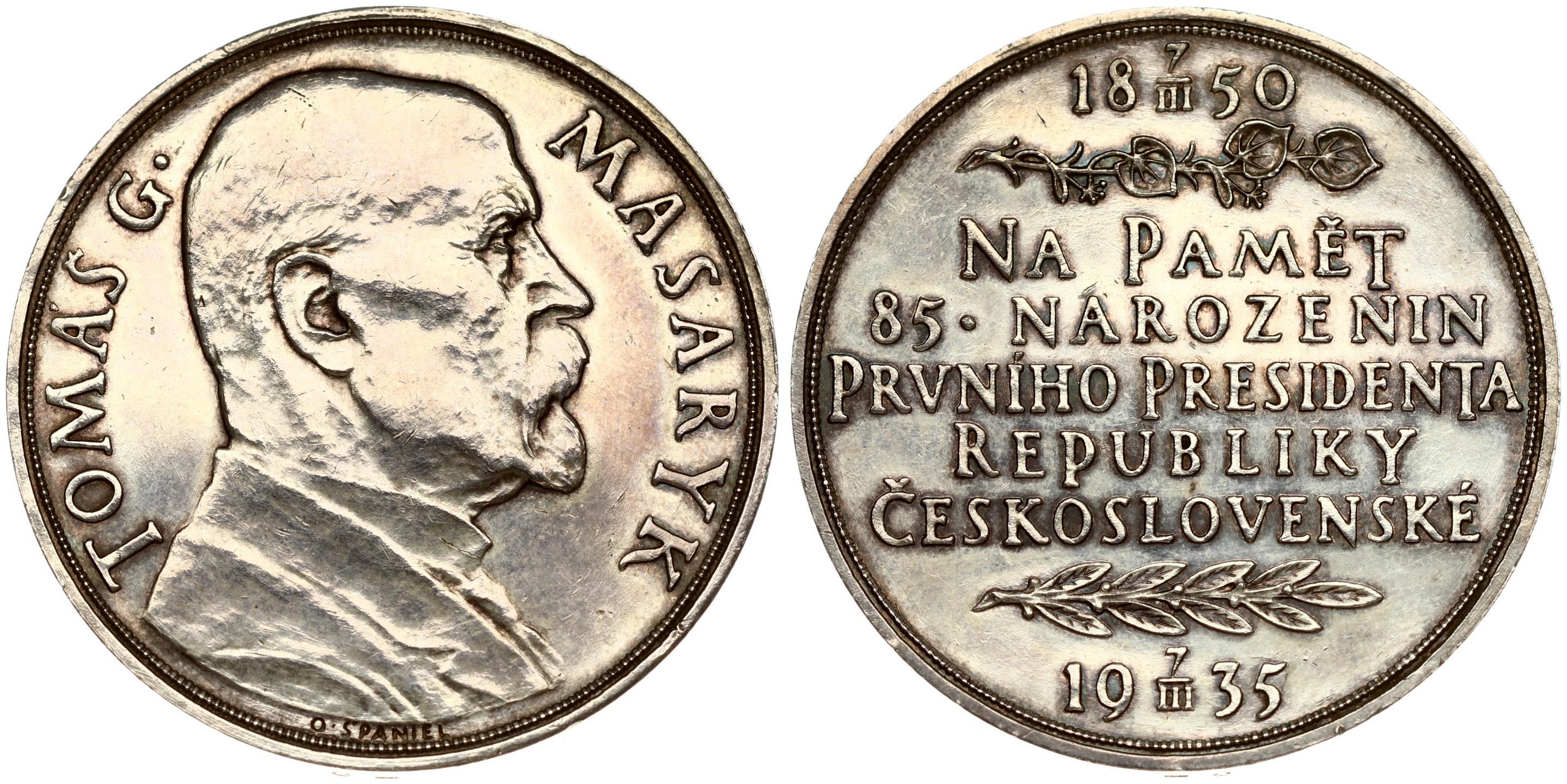 Czechoslovakia Medal 1935 Tomas G Masaryk 85th birthday. Averse Lettering: TOMÁŠ G. MASARYK. Reverse Lettering: 1850 NA PAMĚT 85. NAROZENIN PRVNÍHO PRESIDENTA REPUBLIKY ČESKOSLOVENSKÉ 19 35. Silver. Weight approx: 29.96 g. Diameter: 42 mm