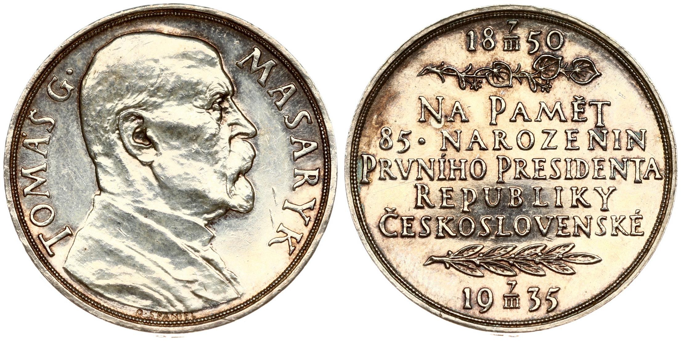 Czechoslovakia Medal 1935 Tomas G Masaryk 85th birthday. Averse Lettering: TOMÁŠ G. MASARYK. Reverse Lettering: 1850 NA PAMĚT 85. NAROZENIN PRVNÍHO PRESIDENTA REPUBLIKY ČESKOSLOVENSKÉ 19 35. Silver. Weight approx: 15.05 g. Diameter: 32 mm