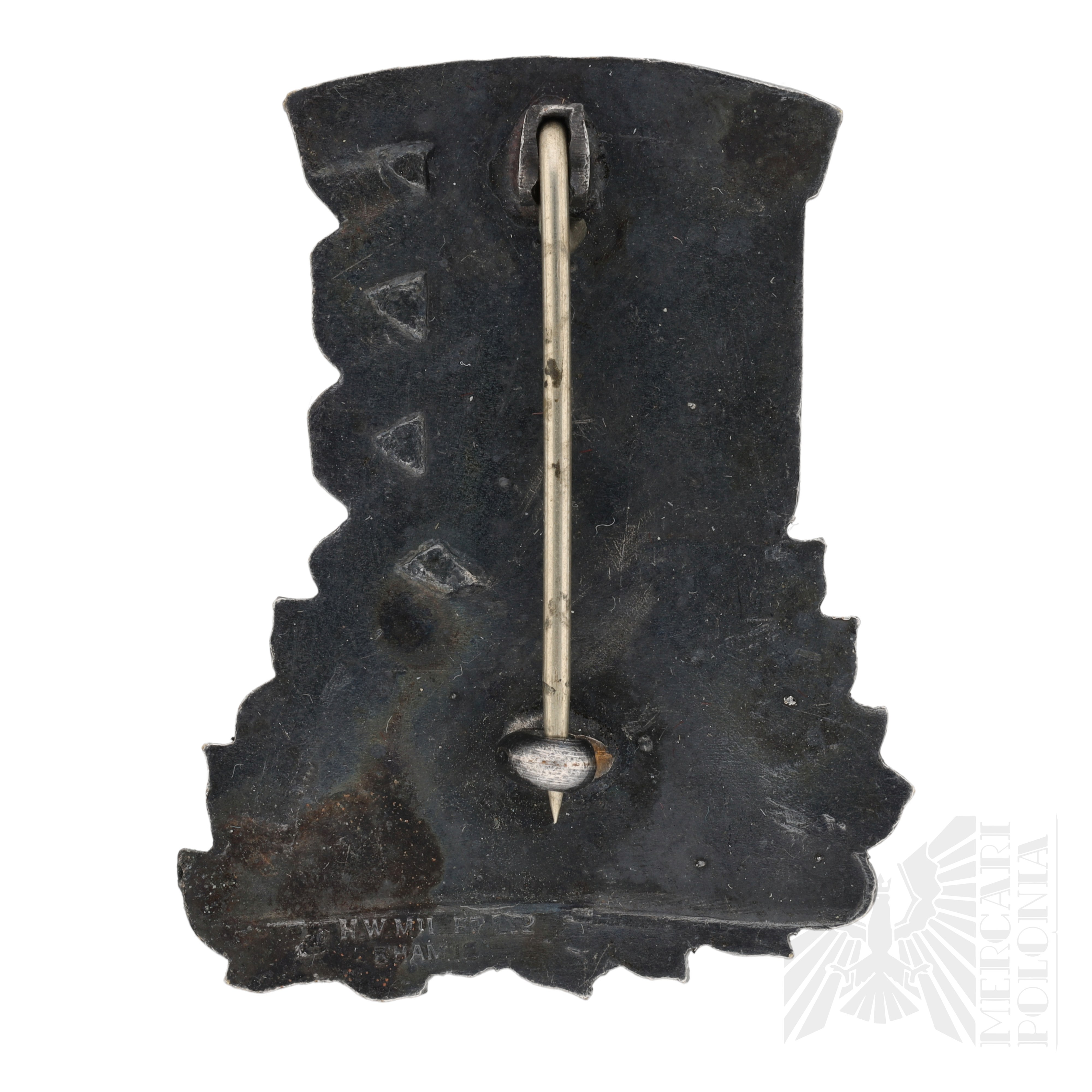 Rzadko spotykana metalowa odznaka piersiowa, wykonana w Wielkiej Brytanii w okresie II wojny światowej dla żołnierzy armii czechosłowackiej stacjonującej w Wielkiej Brytanii. Egzemplarz zapinany na szpilkę. Na rewersie wybito nazwę producenta „H.W. MILLER LTD. B’HAM 13”.