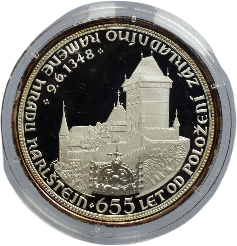 Dostál J., AR medaile - 655. výročí položení zákl. kamene hradu Karlštejn, Ag999, 50mm, 42g, kapsle, patina