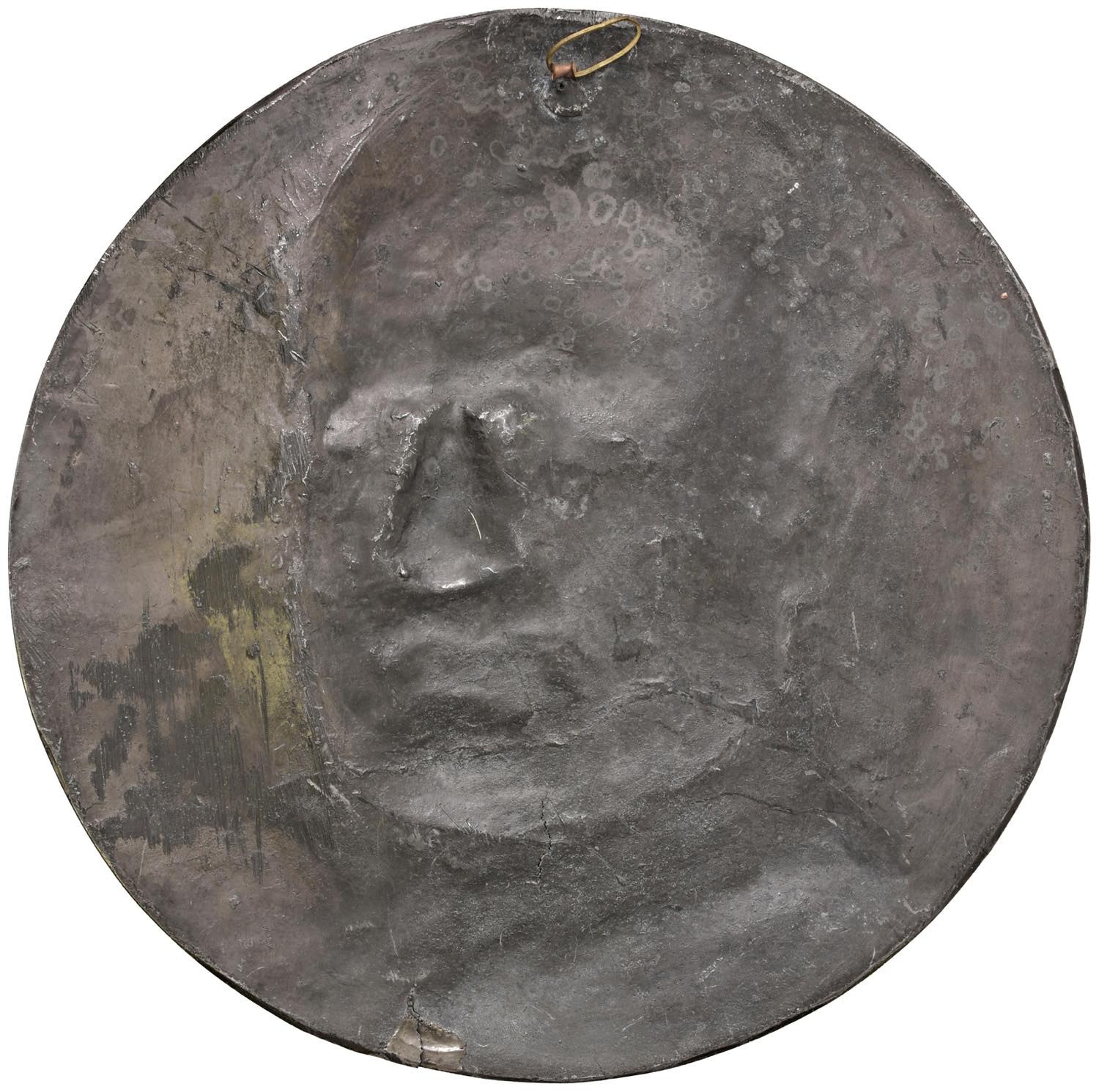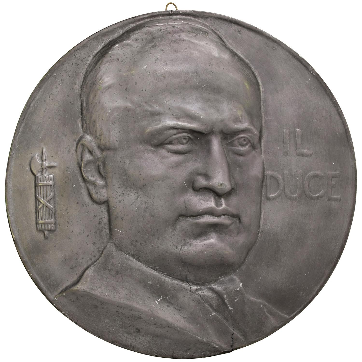 MEDAGLIE FASCISTE. Benito Mussolini (1922-1943) Grande Placca uniface con effige: "IL DUCE" e fascio - Senza firma - SN (g 1477 - Ø 250 mm) Frattura nella parte bassa, appiccagnolo per affissione