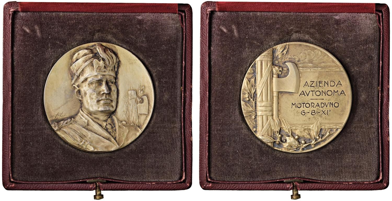 MEDAGLIE FASCISTE Ventennio (1922-1943) Medaglia (1933) A. XI dell'Era Fascista Azienta Autonoma, Motoraduno - Opus: A. Berti, edizione Johnson - R - AG dorato 800 marcato (g 50,48 - Ø 44,5 mm) Marcato 800 al bordo. Con cofanetto Johnson