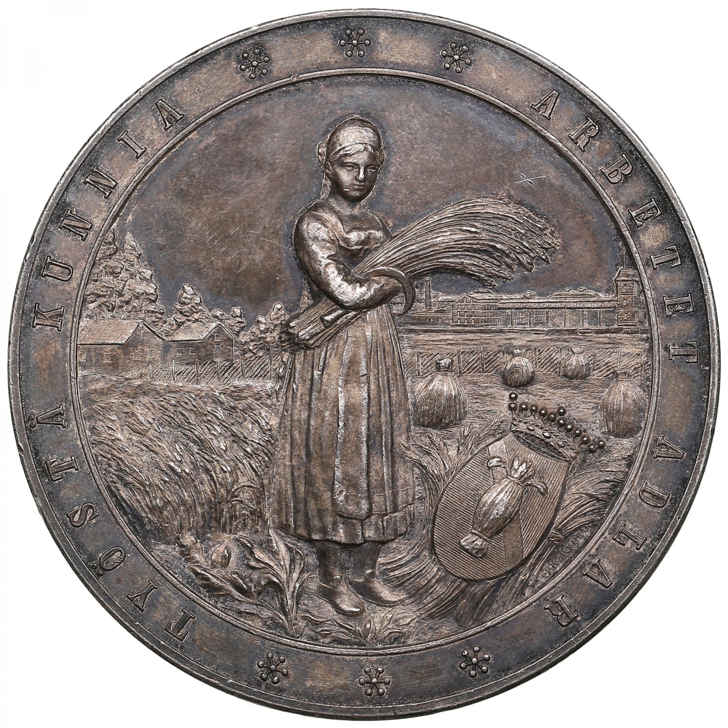 76.18g. 57mm. AU/UNC. Beautiful prooflike exemplar with old patina. Medalier: A. Griliches Sr. (signature on obverse at lower right: ГРИЛИХЕСЪ). Smirnov 1023. Rare. Obv.: Female figure in national dress holding a sheaf of wheat, rural landscape in the background, crowned municipal arms of Vaasa below. Inscription around: TYÖSTÄ KUNNIA - ARBETET ADLAR (Honor through work – Labor ennobles). Rev.: Coat of arms of the Grand Duchy of Finland - crowned lion within a shield, flanked by branches of grain and laurel. Inscription around:10:S ALLMÄNNA FINSKA LANDTBRUKSMÖTET - 10:S YLEINEN SUOMEN MAATALOUSKOKOUS - 1894 (10th General Finnish Agricultural Meeting 1894). The 10th General Finnish Agricultural Meeting held in Vaasa in 1894 was part of a series of exhibitions promoting modern farming techniques, animal husbandry, and rural development within the Grand Duchy of Finland under Russian rule. These exhibitions encouraged innovation, rewarded excellence in agricultural production, and symbolized the government’s support for economic progress in Finland. This medal, struck at the St. Petersburg Mint by Avenir Griliches Sr., was awarded to participants and stands as a rare testimony to Finland’s agrarian modernization at the close of the 19th century.