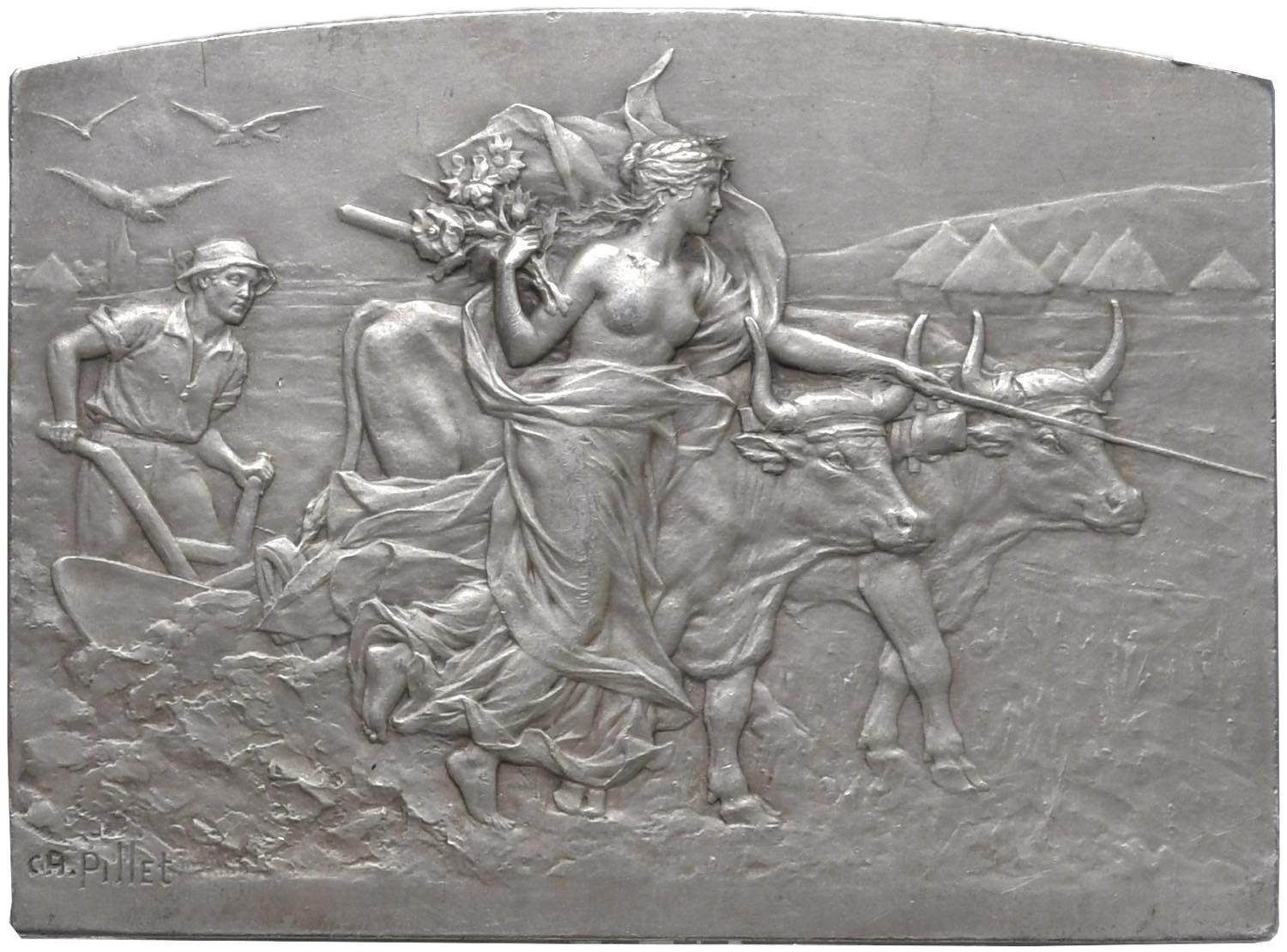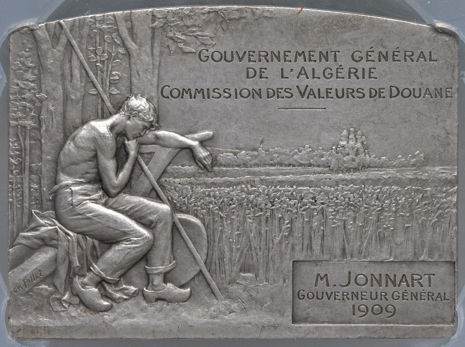 FRANCIA. Gouvernement Gènèrale d'Agricoltura d'Algeria Placchetta coloniale 1909 Commissione dei Valori e Dogana M.Jonnart - Opus: C.A. Pillet - AG (Ø 48x65 mm) Sul bordo punzone: Cornucopia (dal 1880 in poi) 1 ARGENT. Rarissima placchetta in argento rappresentazione dell'Art Decò francese. In slab NGC MS 62 cod. 5788899-006