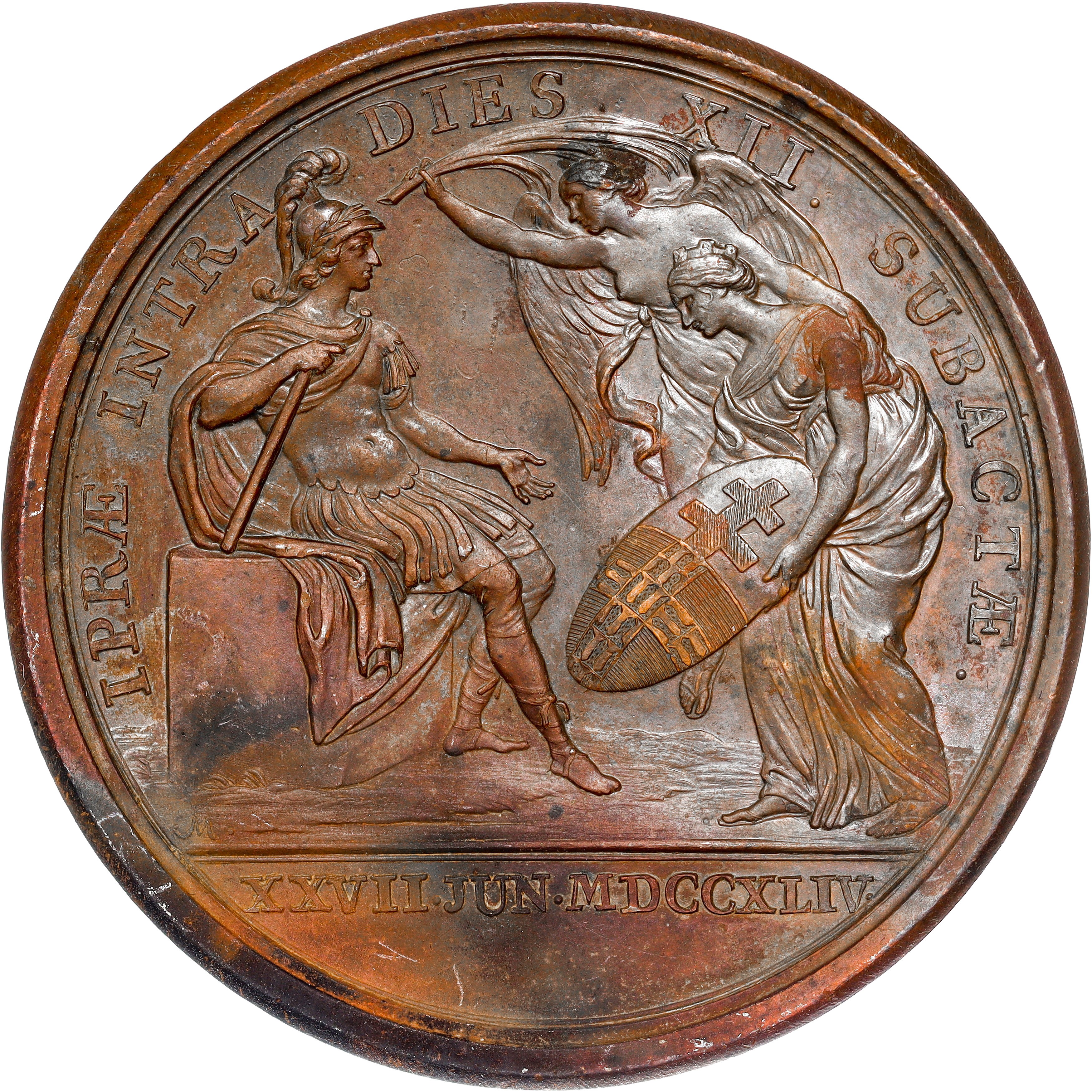 Le Roi, habillé à l'antique, assis à droite, tenant son bâton de commandement, reçoit l'écu de la ville d'Ypres, conduite par une Victoire ; à l'exergue signature M. et (date)