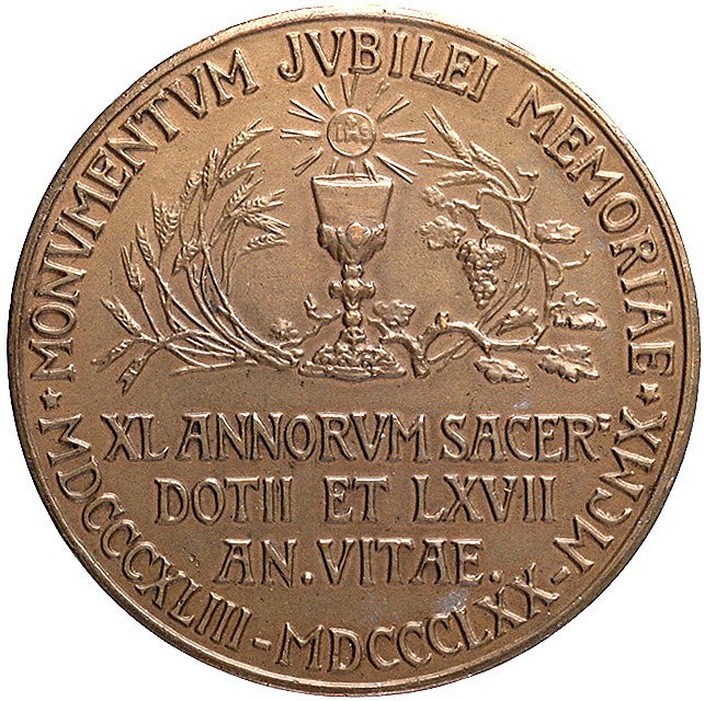 POLSKA, Franciszek Dembski- medal autorstwa Jana Raszki z okazji 40- lecia święceń kapłańskich 1910 r., Aw: Popier- sie w lewo i napis, u dołu sygn., Rw: Monstrancja otoczona kłosami i winoroślą, napisy i daty w otoku, poziomo XL ANNORVM SACERDOTII ET LXVII AN VITAE, Strzałk.180, brąz, 40 mm