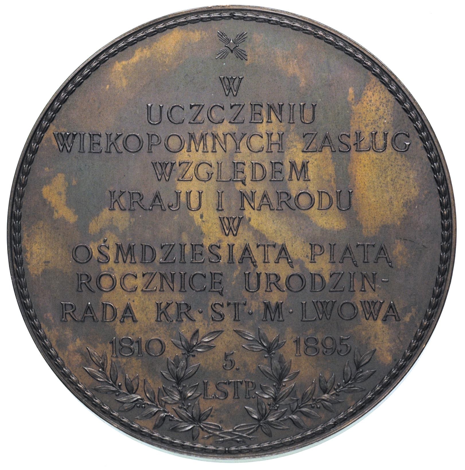 POLSKA, Franciszek Smolka-medal autorstwa A. Scharfa 1895 r., Aw: Popiersie trzyczwarte w lewo i napis w otoku, Rw: Napis poziomy W UCZCZENIU WIEKOPOMNYCH ZASŁUG WZGLĘDEM KRAJU I NARODU W OŚMDZIESIĄTĄ PIĄTĄ ROCZNICĘ URODZIN RADA KR. ST. M. LWOWA 1810-1895 5 LSTP., brąz 119.14 g, 64.3 mm