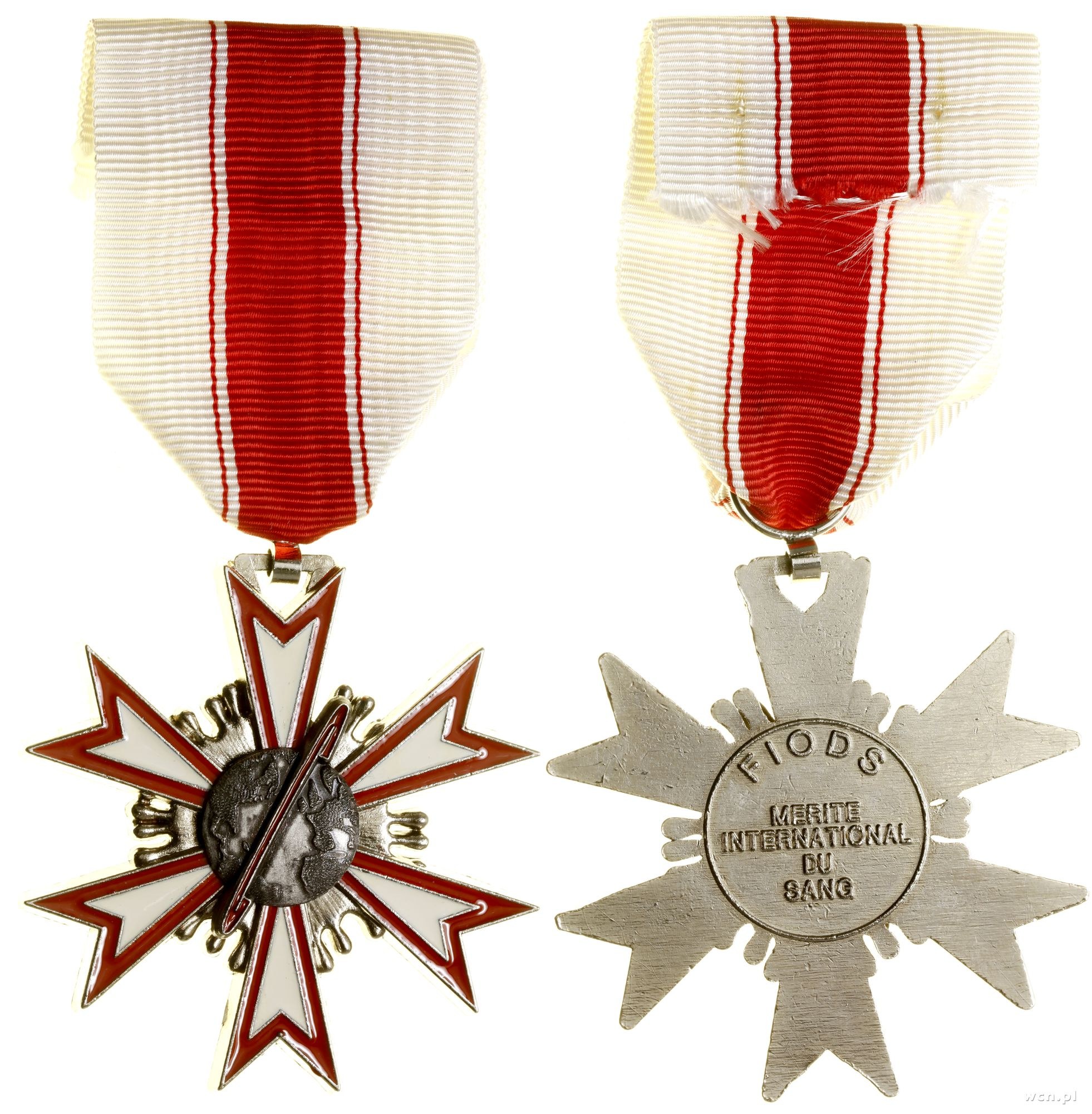 Sześcioramienny krzyż, w kątach promienie w kształcie kropli krwi, na środku Ziemia z ukośnie ułożonym czerwonym pierścieniem, na stronie odwrotnej na środku FIODS / MERITE / INTERNATIONAL / DU / SANG, odznaka dwuczęściowa, mocowana na wstążkę