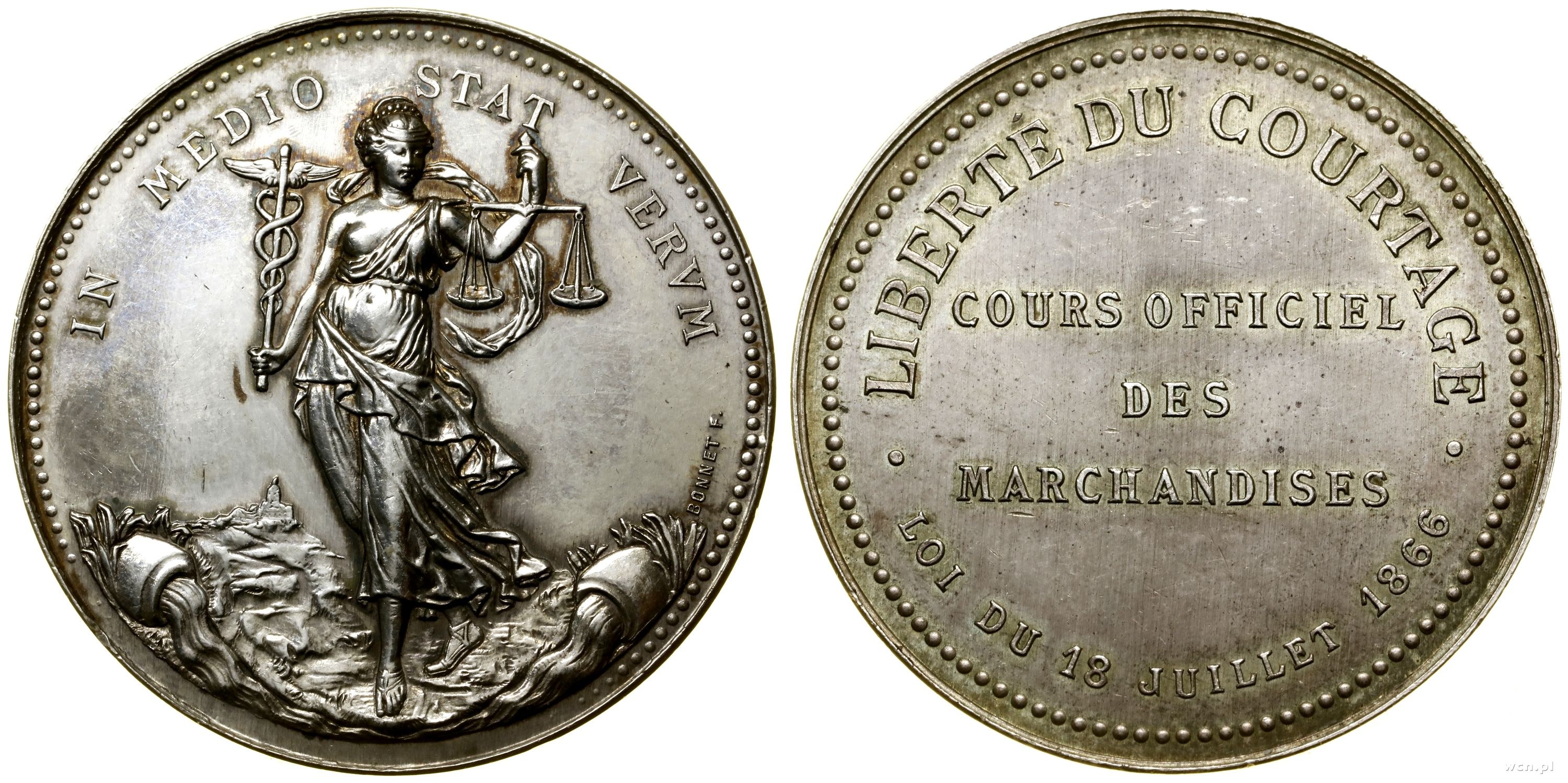 Aw: Kobieta z wagą i laską eskulapa idąca przy źródłach dwóch rzek (Rodan i Saona), po prawej sygnatura BONNET F., IN MEDIO STAT VERVM, Rw: COURS OFFICIEL / DES MARCHANDISES, LIBERTE DU COURTAGE - LOI DU 18 JUILLET 1866, Obrzeże: Punca ARGENT