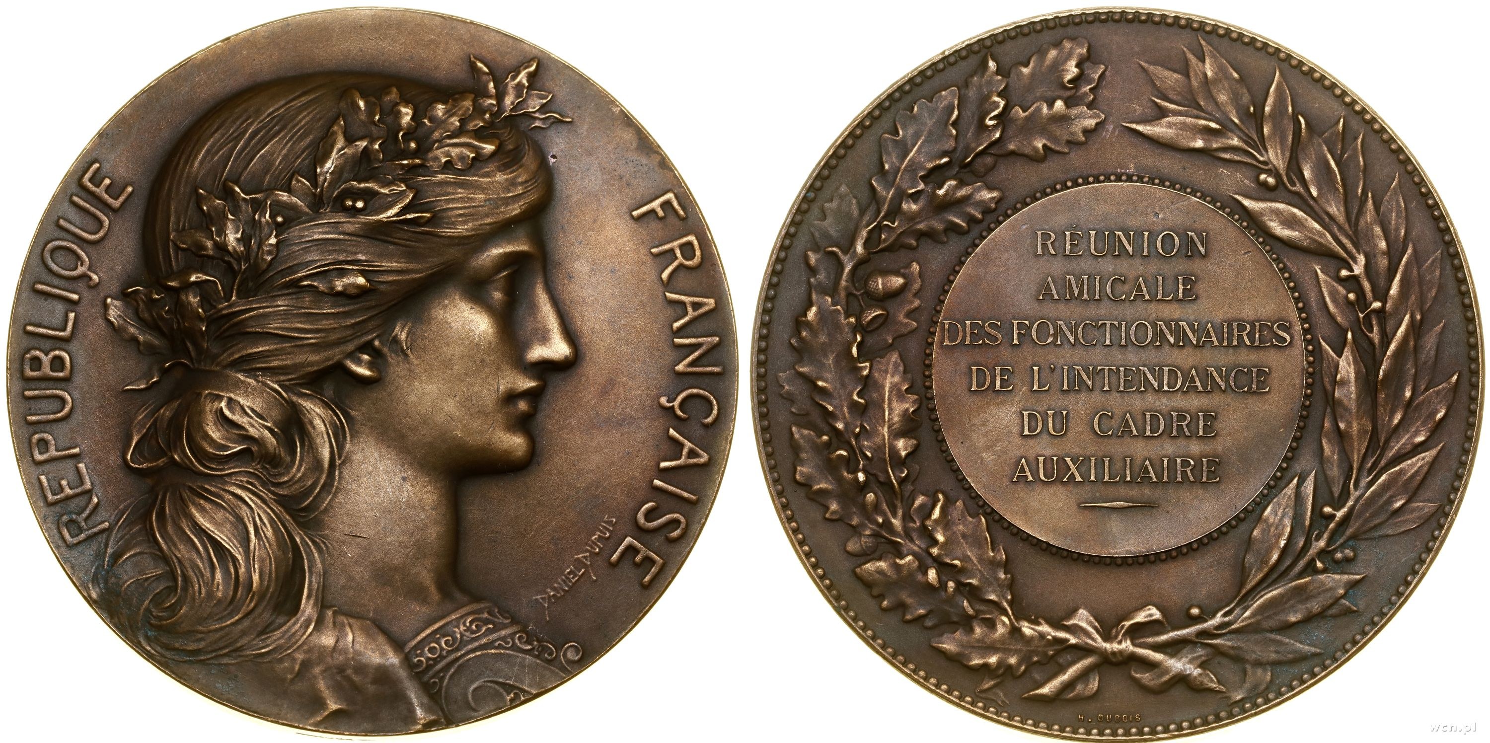 Aw: Popiersie w prawo, po prawej sygnatura DANIEL DUPUIS, REPUBLIQUE - FRANÇAISE, Rw: Wieniec, w którym medalion, w medalionie RÉUNION / AMICALE / DES FONCTIONNAIRES / DE L'INTENDANCE / DU CADRE / AUXILIARE, na dole sygnatura H. DUBOIS (Heni Dubois 1859–1930), Obrzeże: Punca BRONZE
