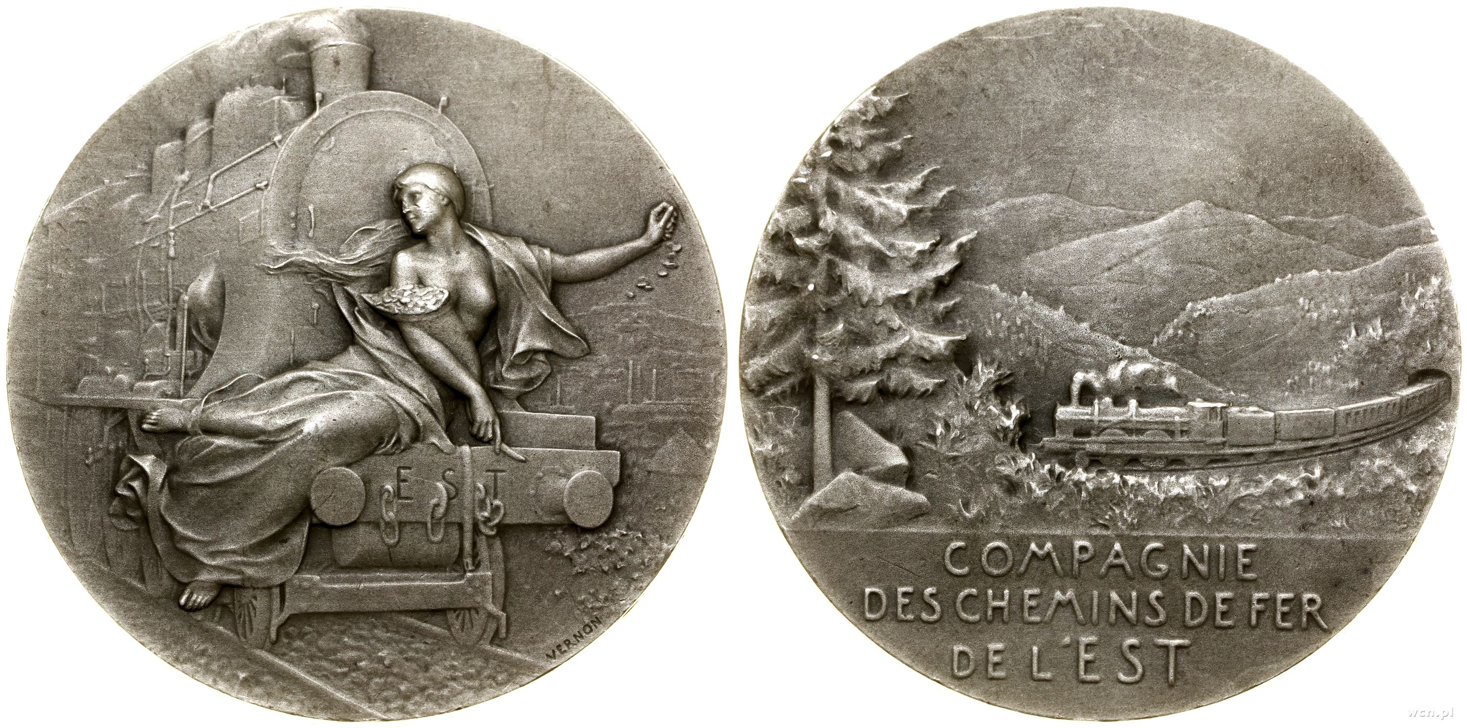Aw: Kobieta z rogiem obfitości, siedząca na froncie lokomotywy, na dole po prawej sygnatura VERNON, Rw: Lokonotywa wyjeżdżająca z tunelu w górach, w odcinku COMPAGNIE / DES CHEMINS DE FER / DE L'EST, Obrzeże: Punca ARGENT
