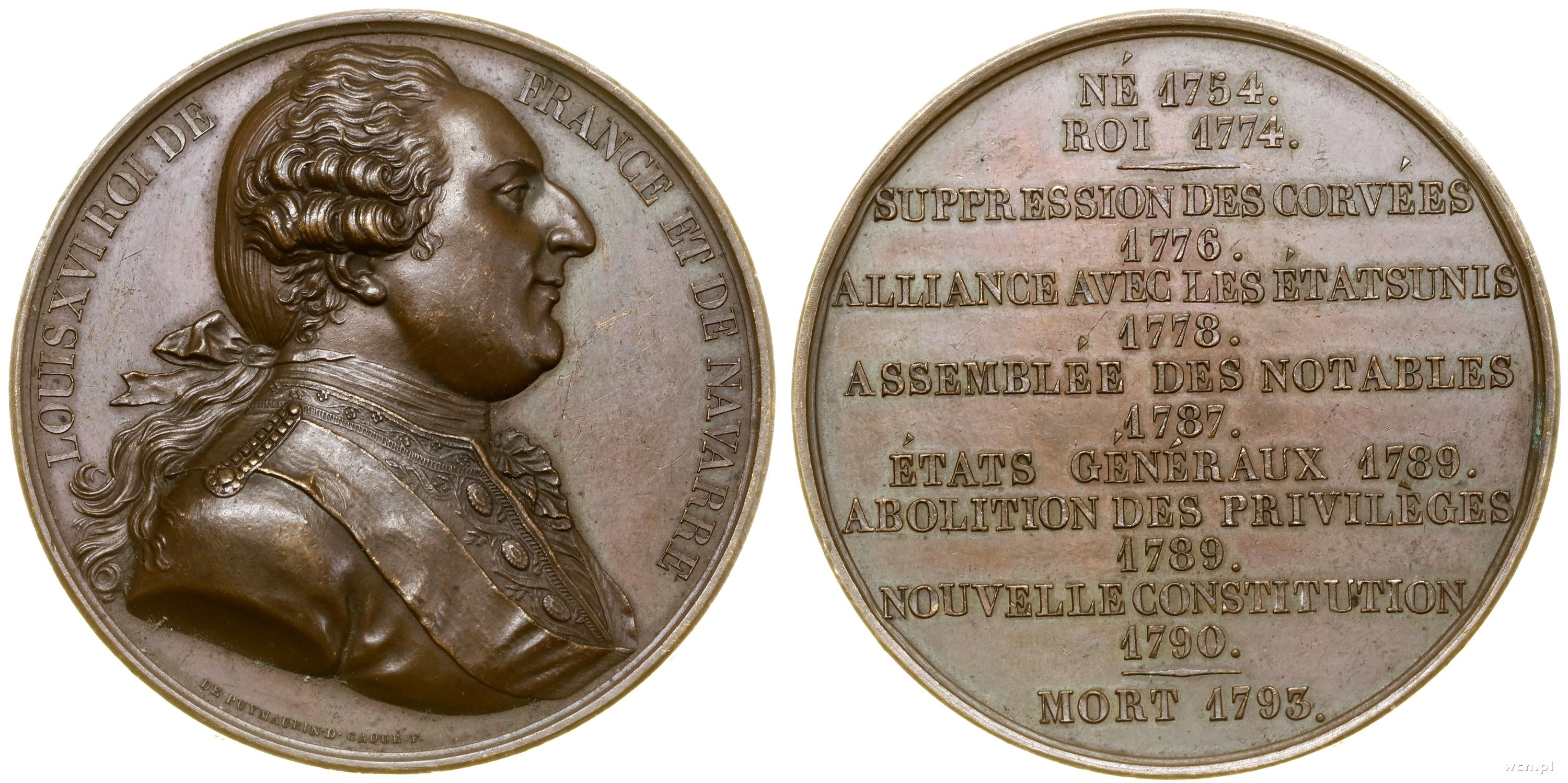 Aw: Popiersie władcy w prawo, poniżej sygnatura DE PUYMAURIN D CAQUE F, w otoku LOUIS XVI ROI DE FRANCE ET DE NAVARRE, Rw: NE 1754. / ROI 1774. / - / SUPPRESSION DES CORVÉES / 1776. / ALLIANCE AVEC LES ÉTATS UNIS / 1778. / ASSEMBLÉE DES NOTABLES / 1787. / ÉTATS GÉNÉRAUX 1789. / ABOLITION DES PRIVILÈGES / 1789. / NOUVELLE CONSTITUTION / 1790. / - / MORT 1793.