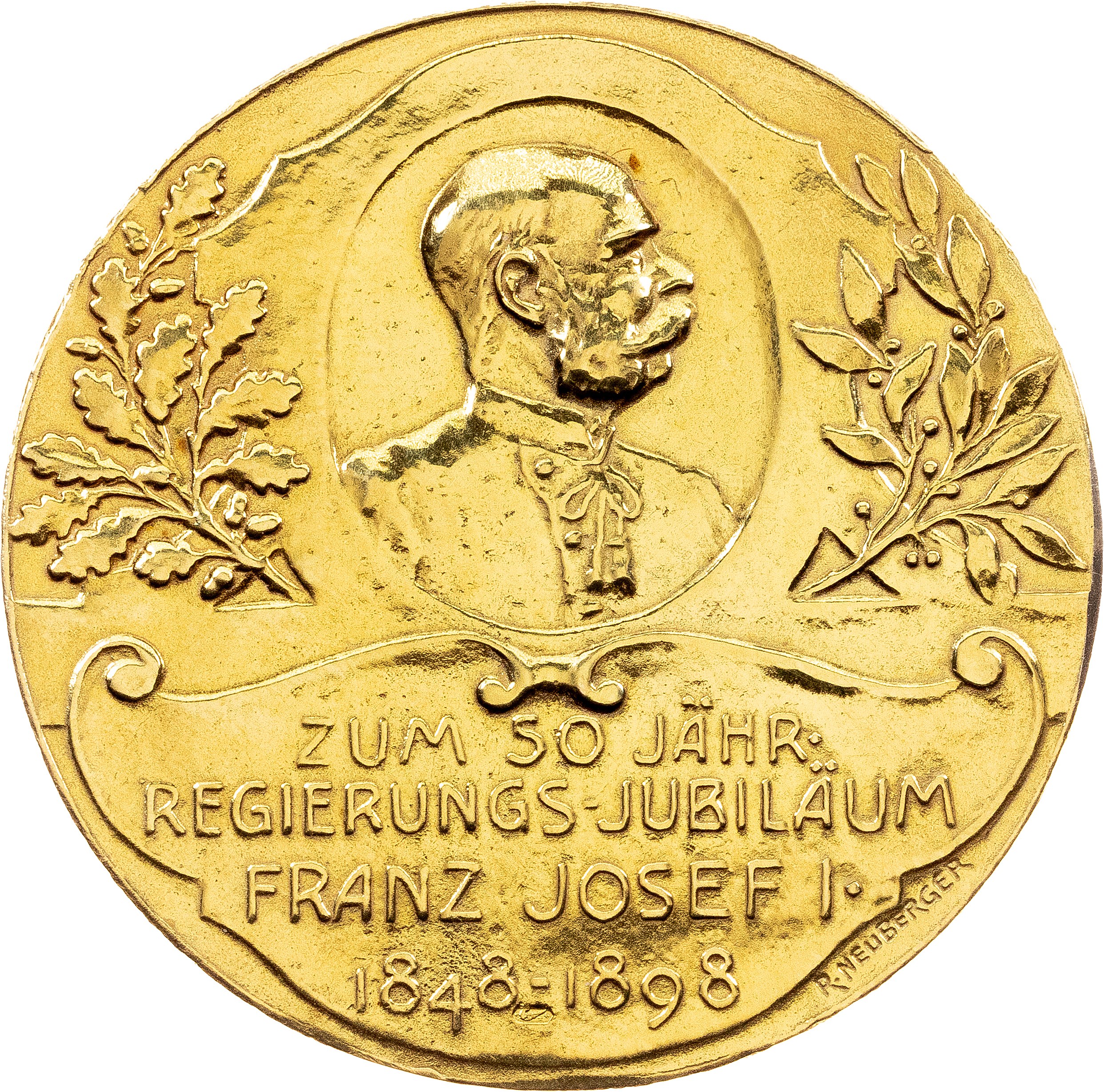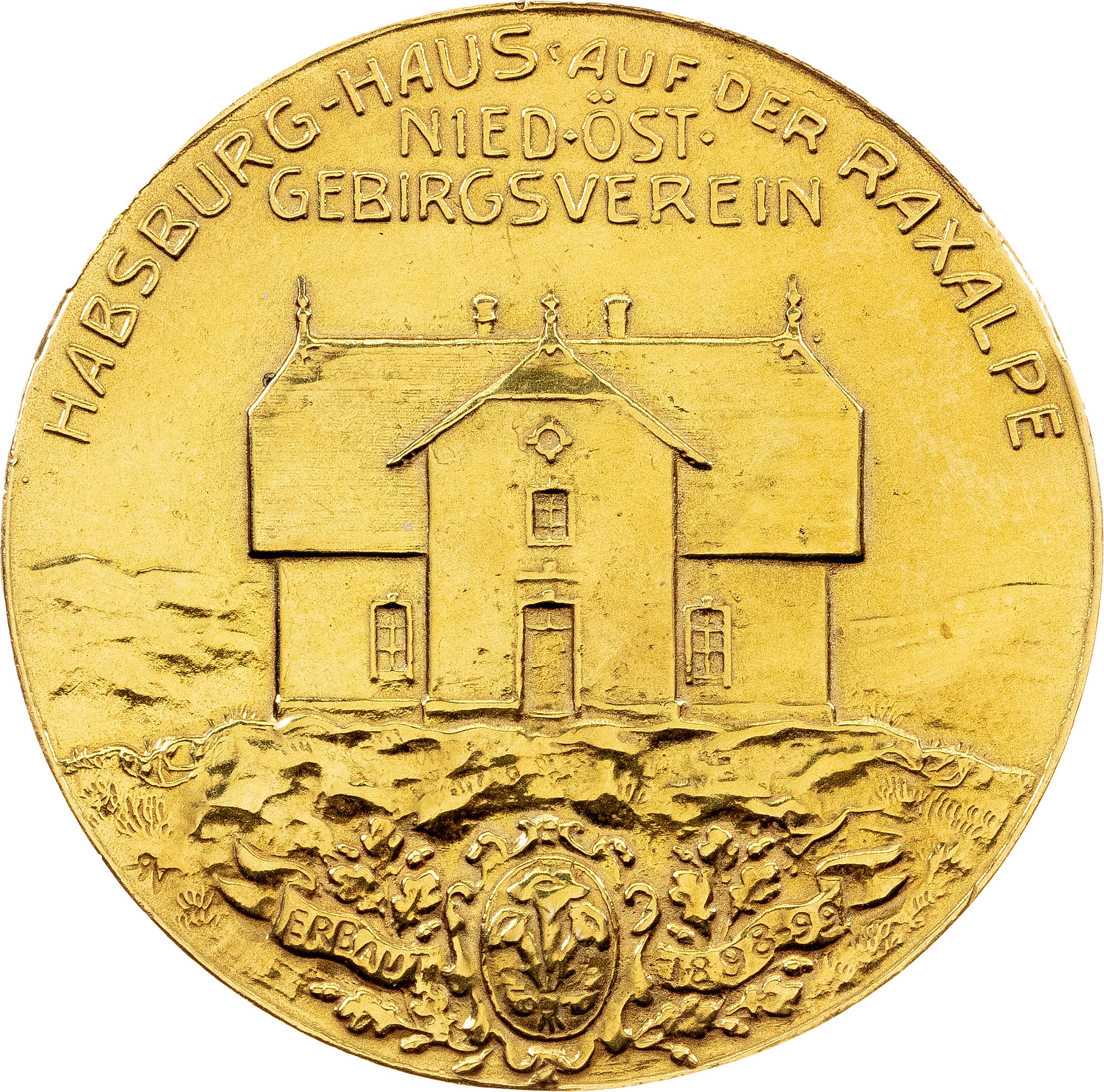 Description: LATER STRIKE; By R. Neuberger; "50th Anniversary of the Reign of Franz Joseph I. - Habsburghaus in the Rax"; Obv: Bust of the Emperor Franz Joseph facing right in the medallion-shaped frame surrounded by oak branches, and an inscription in four lines below "ZUM 50 JÄHR. REGIERUNGS-JUBILÄUM FRANZ JOSEPH I. 1848-1898" / Rev: Habsburghaus (a mountain hut belonging to the Austrian Alpine Association (ÖAV), located on the Rax plateau at 1786 meters above sea level on the border between Lower Austria and Styria) standing on the hill, The House of Habsburg standing on a rock, with a flower and inscription "ERBAUT 1898-99" below, and the inscription above "HABSBURG-HAUS AUF DER RAXALPE NIED. ÖST. GEBIRGSVEREIN"