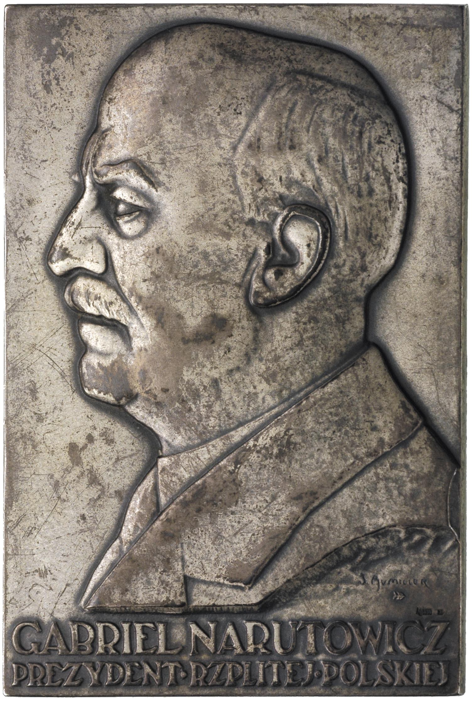 PLAKIETY, Gabriel Narutowicz-plakieta autorstwa J. Aumillera 1926 r.; Popiersie w lewo i napis u dołu w dwóch rzędach GABRIEL NARUTOWICZ PREZYDENT RZPLITEJ POLSKIEJ, srebro 236.81 g, 61 x 91 mm, Strzałkowski 1, bardzo rzadka