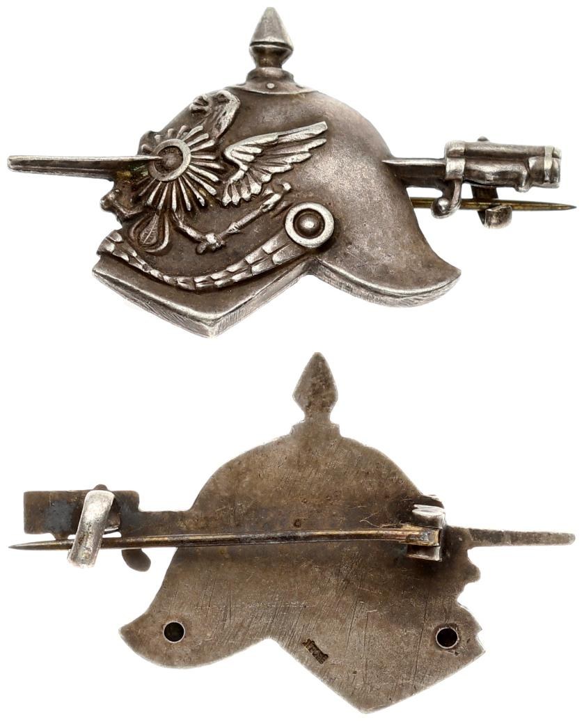 Germany Badge (1918). Helmet pierced with a bayonet. On the other side there is a clasp and a brand of the master (FROSE). Bronze silbered. With certificate. Weight approx: 4.83 g. Diameter: 27.5x 42 mm.