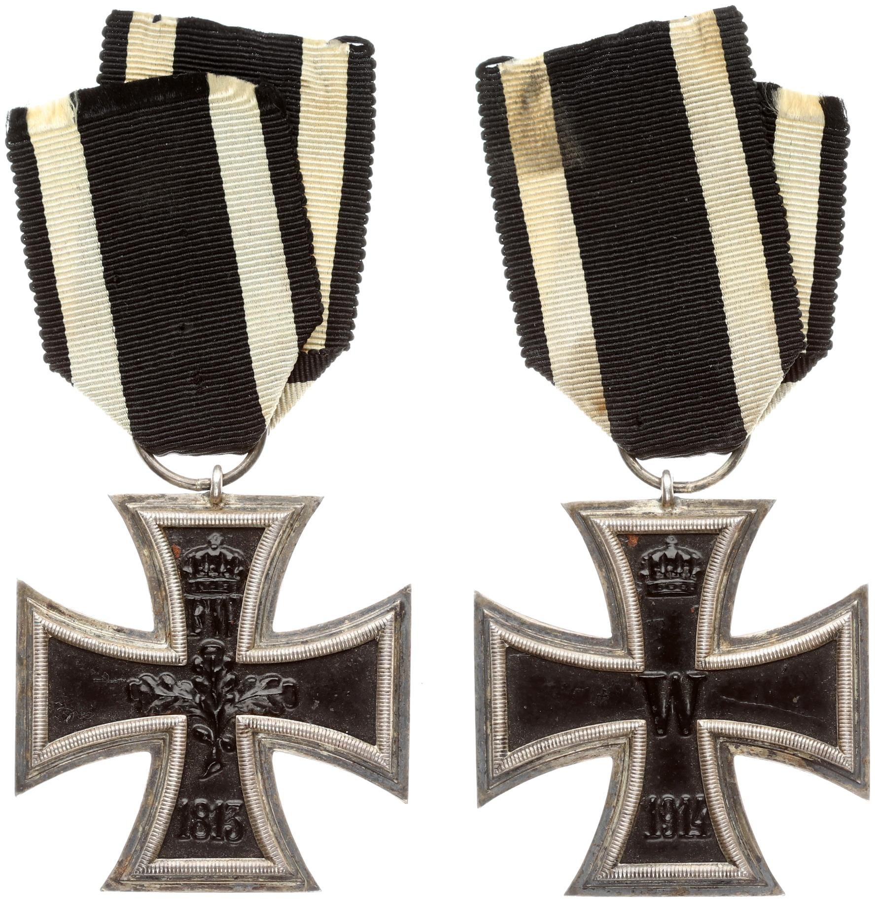 Germany Iron Cross Medal (1914) Type III: II Class; issued for combat (instituted 10 March 1813). Averse: Enameled cross pattée; with large W at center; crown above; 1914 below. Reverse: Oak sprig at center; crowned FW above; 1813 below. Iron silvered. Barac 54. Weight approx: 19.49 g. Diameter: 46x43 mm.