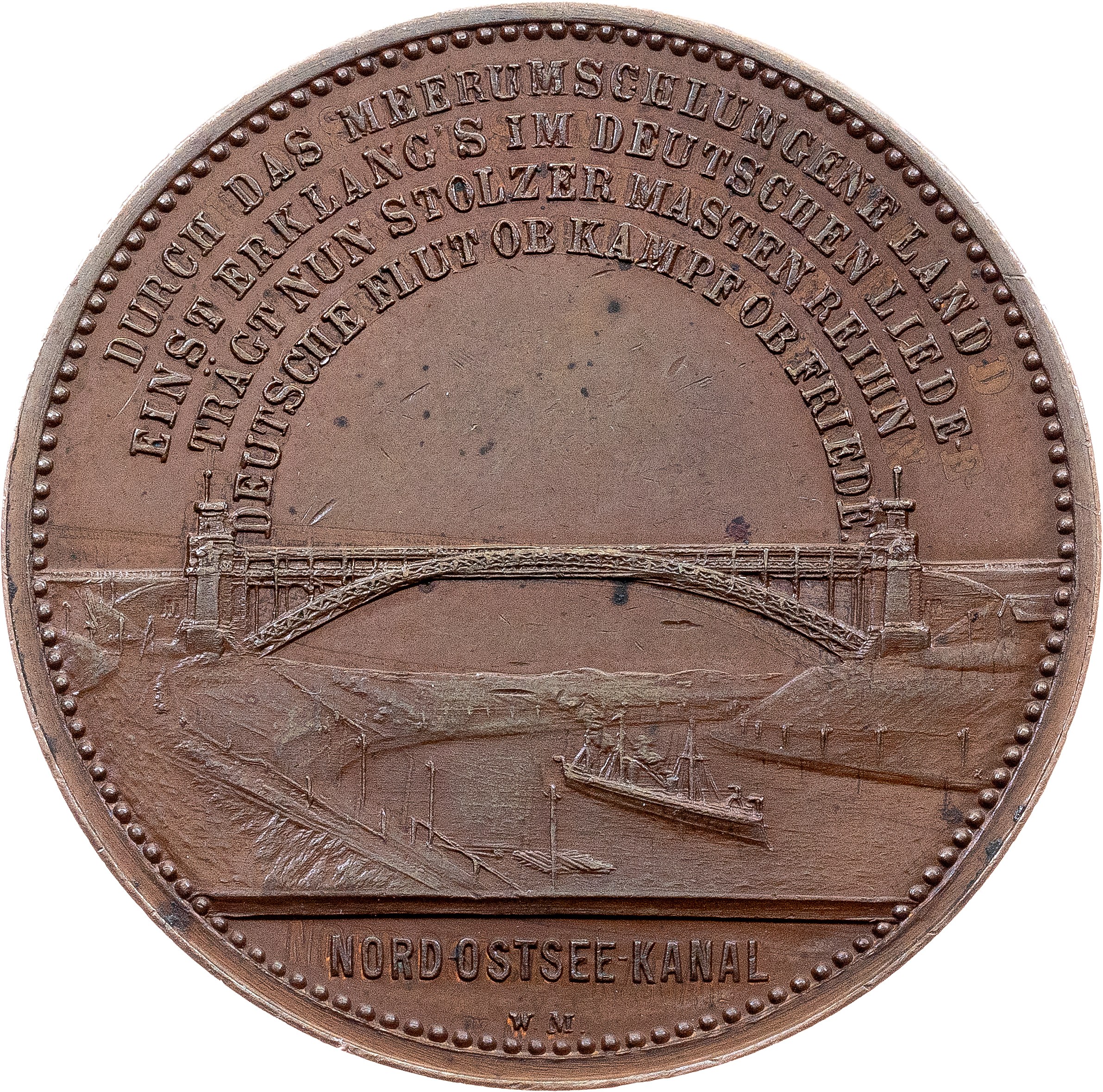 Description: "Opening of the North Sea and Baltic Sea canal"; Obv: Busts of Wilhelm II., Friedrich III., and Wilhelm I. facing right, laurel branch below, and the circular inscription "BEGONNEN UNTER WILHELM I 1887 ★ VOLLENDET UNTER WILHELM II 1895 ★" / Rev: Ship passing through a canal under a bridge, the inscription "DURCH DAS MEERUMSCHLUNGENE LAND EINST ERKLANG'S IM DEUTSCHEN LIEDE TRÄGT NUN STOLZER MASTEN REIHN DEUTSCHE FLUT OB KAMPF OB FRIEDE.", "NORD-OSTSEE-KANAL" in exergue; On June 21, 1895, Kaiser Wilhelm II opened the almost 100km-long waterway in Schleswig-Holstein, which saves ships from having to make long detours between the North Sea and the Baltic Sea. In honor of his grandfather, Wilhelm I, the new waterway was named the Kaiser Wilhelm Canal (also known as Kiel Canal)