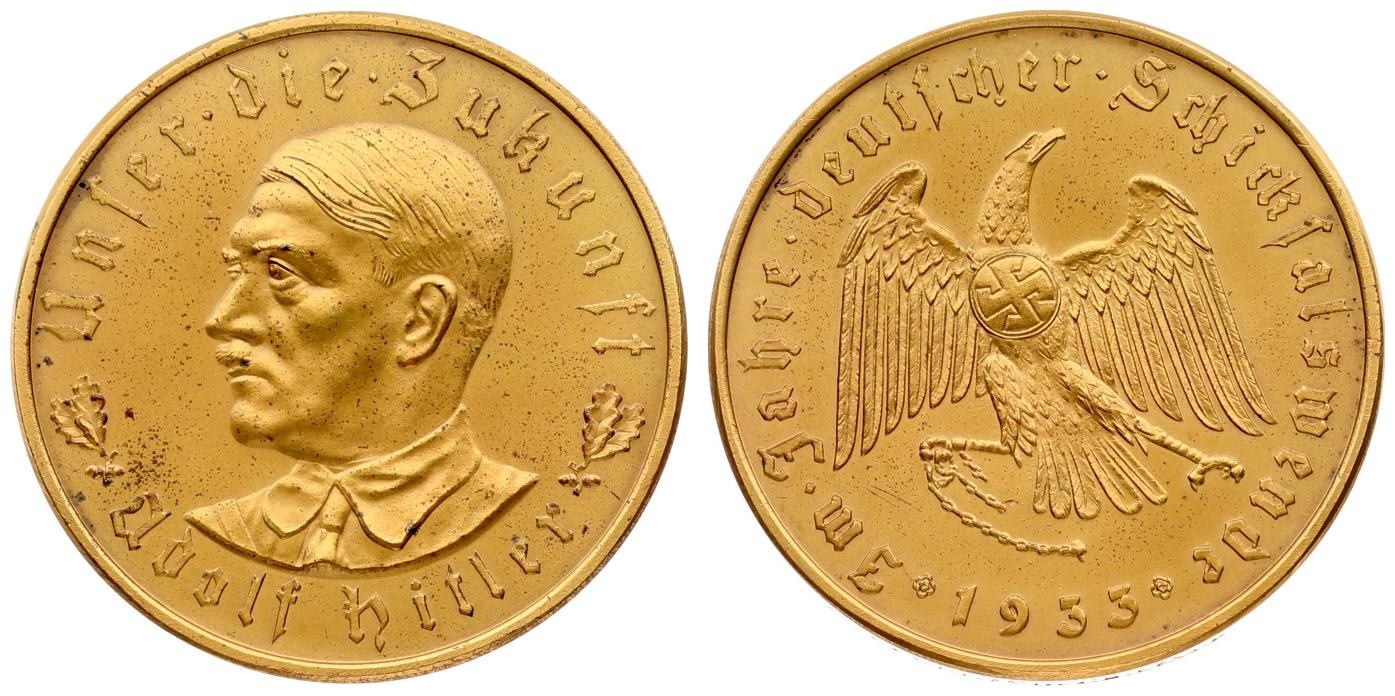 Germany Third Reich Medal 1933. Adolf Hitler (1889-1945). Medal (1933). By O. Glöckler. Commemorating Hitler's Rise to Power. Av: Unser die Zukunft / Adolf Hitler. Bust facing slightly left. Rev: Im Jahre deutscher Schicksalswende / 1933. Eagle facing; head right; with wings spread; holding chain in talons and with swastika shield on breast. Edge: Bayer. Hauptmünzamt. Colbert/Hyder 30. Bronze. Weight approx: 21.73 g. Diameter: 36 mm. With Original Box