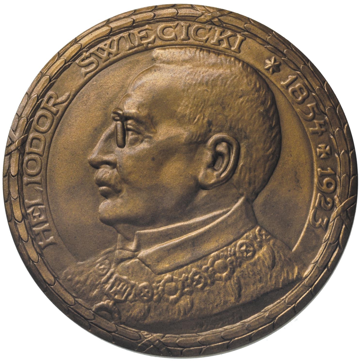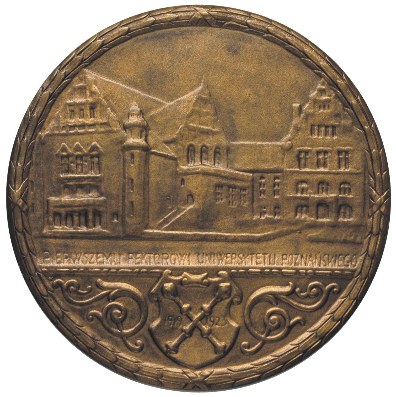 POLSKA, Heliodor Święcicki - pierwszy rektor Uniwesytetu Poznańskiego - medal autorstwa Jana Wysockiego 1923 r., Aw: Popiersie w stroju ceremonialnym i napis w otoku, Rw: Budynki Uniwersytetu, niżej napis PIERWSZEMU REKTOROWI UNIWERSYTETU POZNAŃSKIEGO, niżej tarcza z dwoma berłami i daty 1919-1923, brąz 60 mm, Strzałkowski 509 R