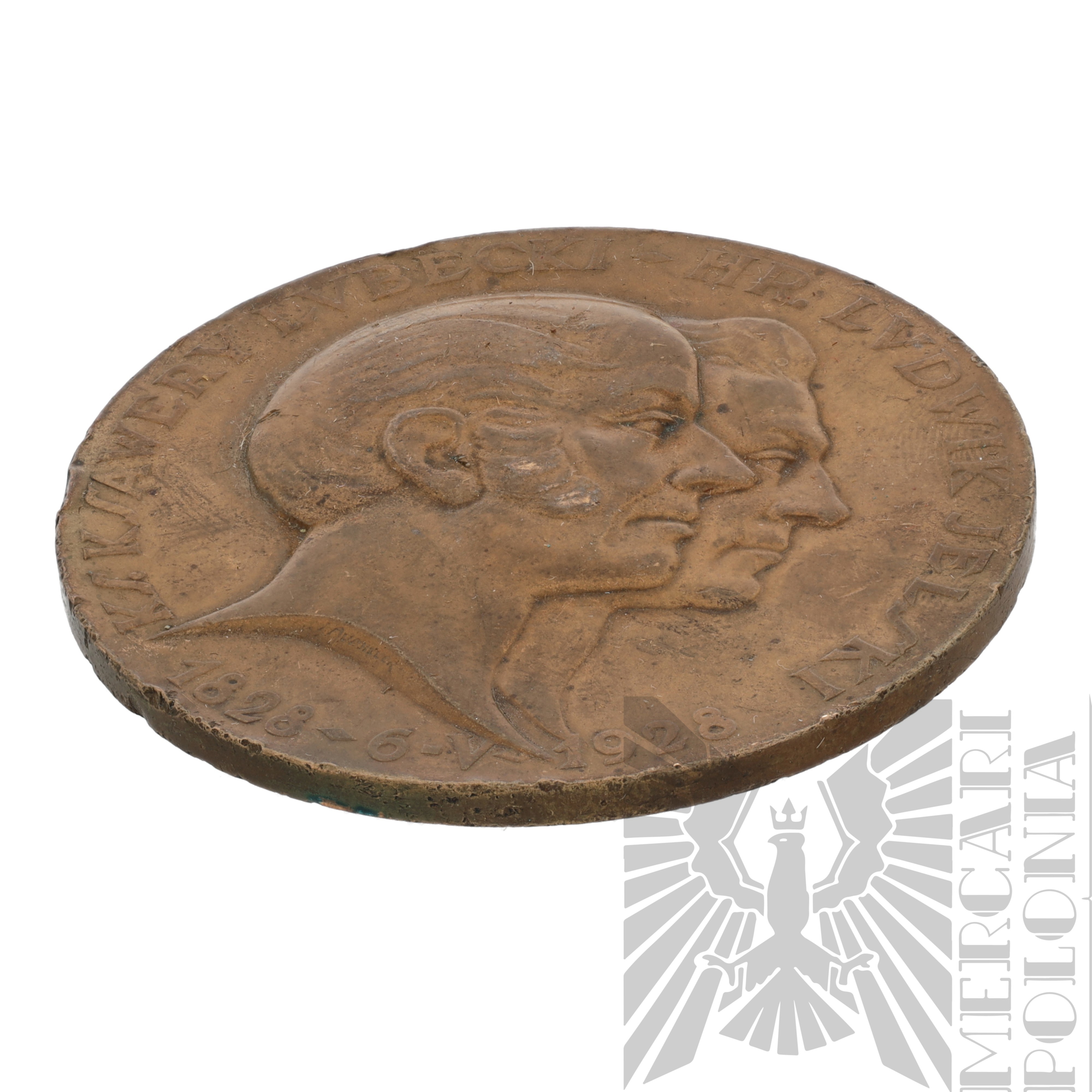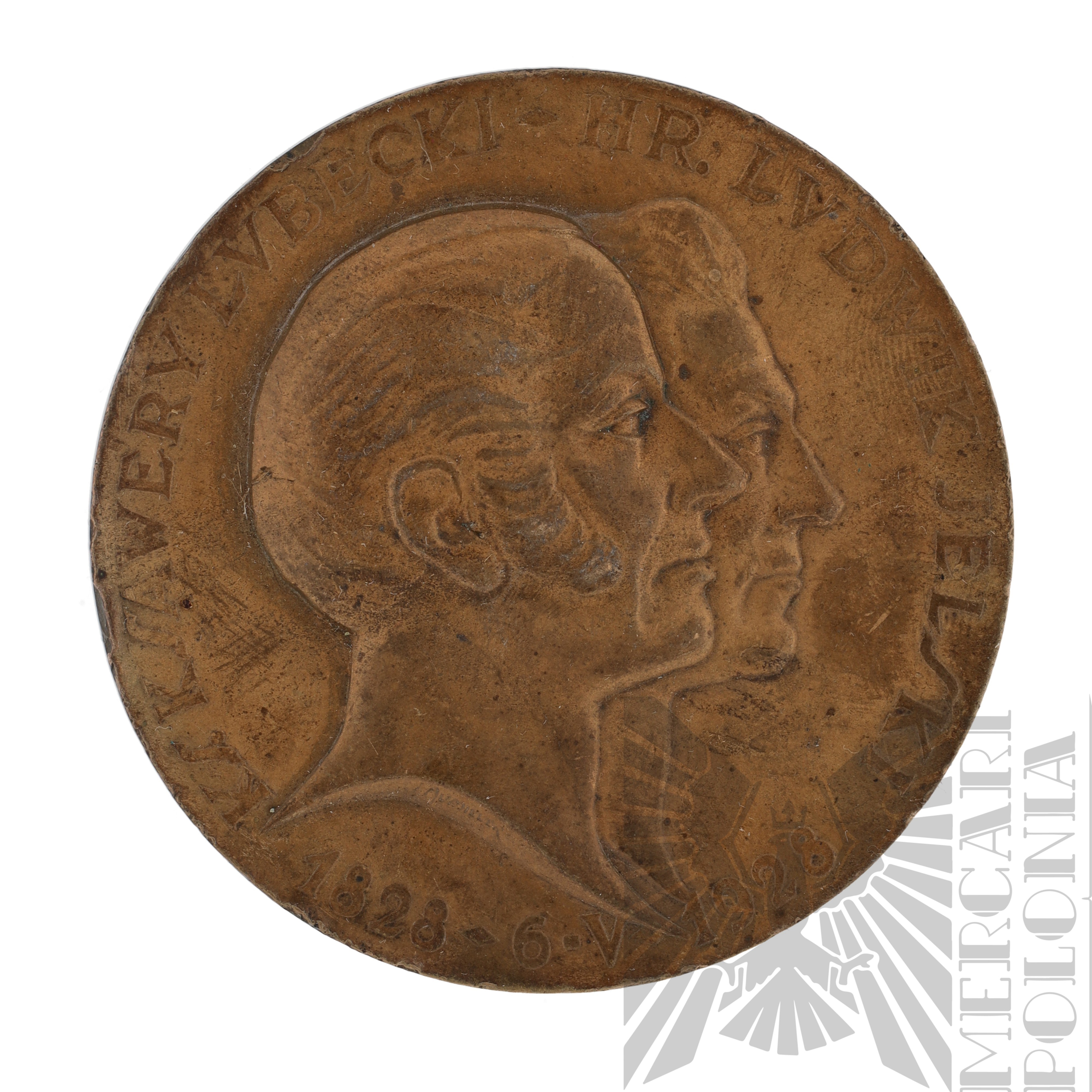 Medal został wybity w 1928 roku z okazji setnej rocznicy powstania Banku Polskiego, jednej z najważniejszych instytucji finansowych w historii Polski. Na awersie znajdują się dwa popiersia zwrócone w prawo – Księcia Ksawerego Druckiego-Lubeckiego oraz hrabiego Ludwika Jelskiego, którzy odegrali kluczową rolę w powołaniu banku do życia. W otoku widnieje napis „KSAWERY LUBECKI – HR. LUDWIK JELSKI”, a u dołu data 1828 – 6.V.1928, nawiązująca do rocznicy utworzenia instytucji. Rewers przedstawia centralny napis umieszczony w prostokątnej ramce, w którym podkreślono znaczenie reaktywowanego w 1924 roku Banku Polskiego jako ostoi ładu pieniężnego w odrodzonej II Rzeczypospolitej oraz wyrażono duchową łączność z przedwieką instytucją i wdzięczność dla obywateli, którzy wspierali Skarb Narodowy. Całość zdobi herb z orłem w tarczy oraz wieńce laurowe symbolizujące zasługi i trwałość instytucji. U dołu wybita jest data rzymska MCMXXVIII oznaczająca rok wybicia medalu.