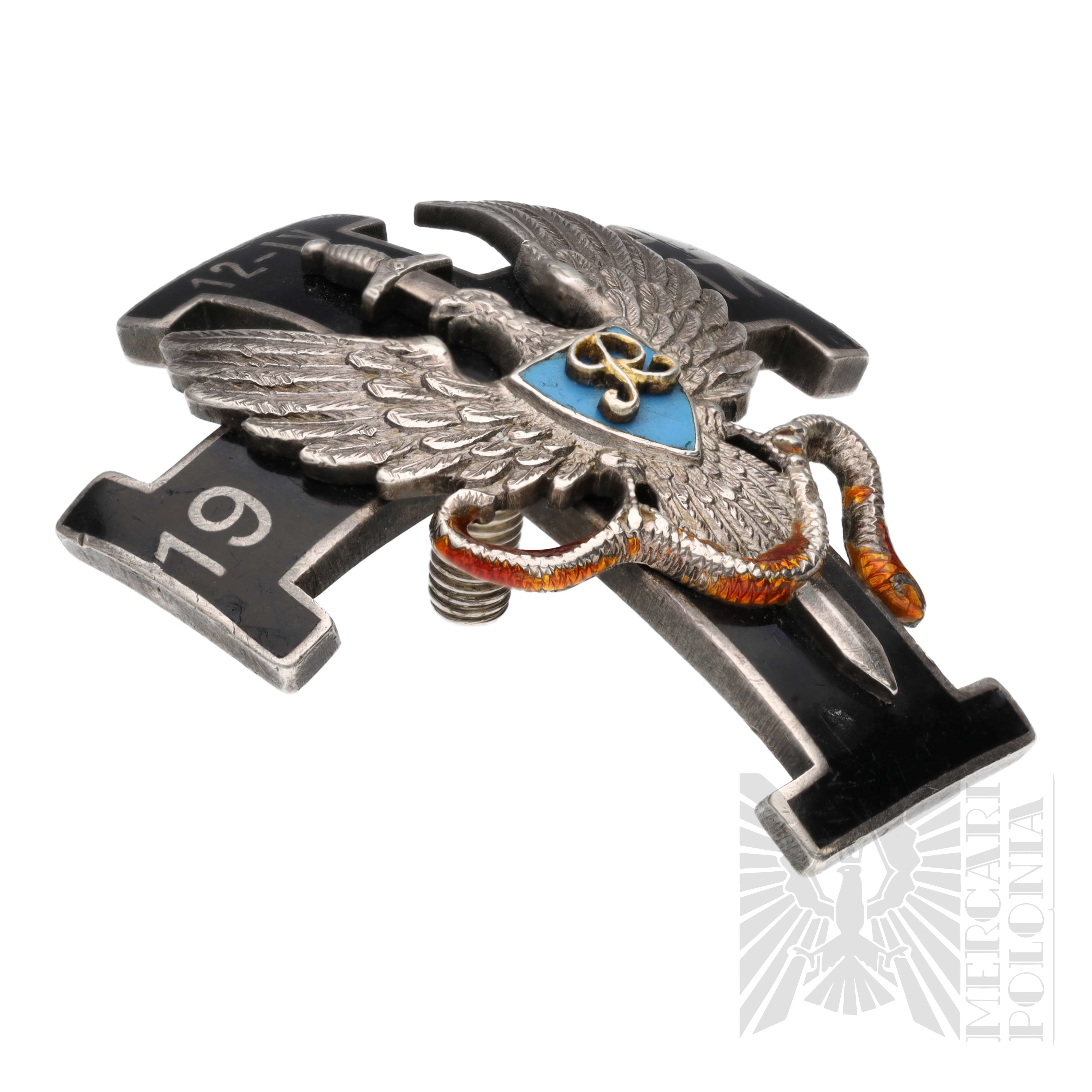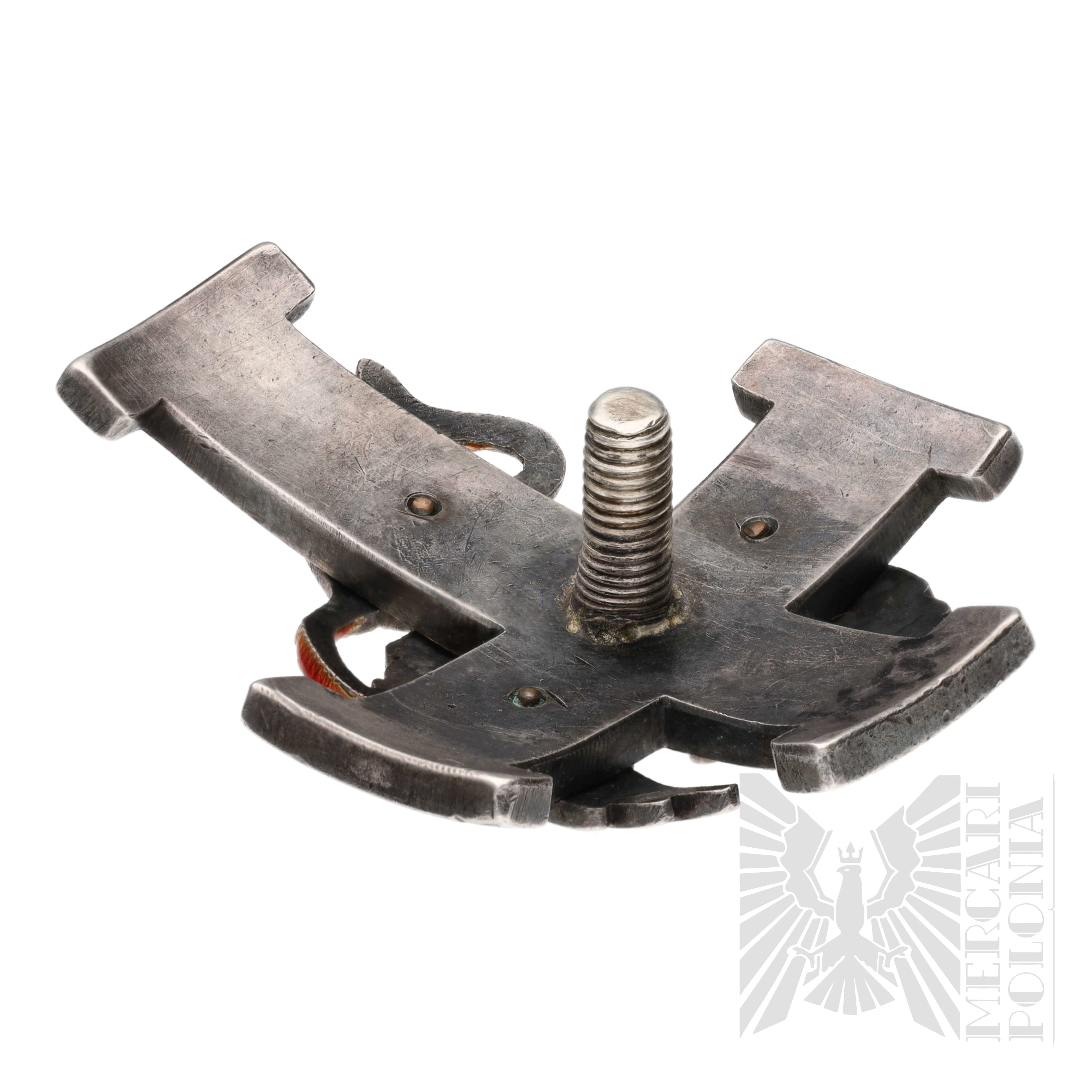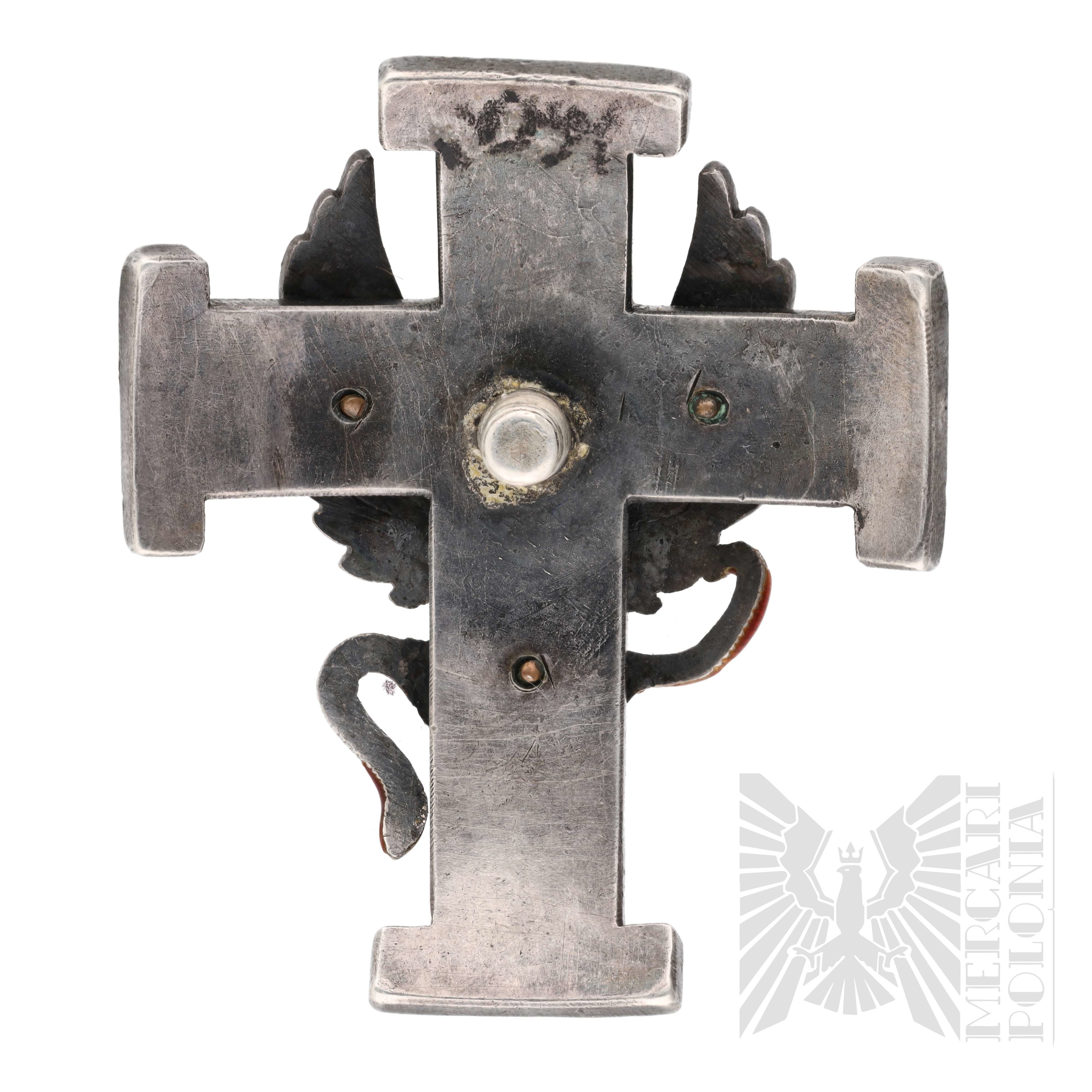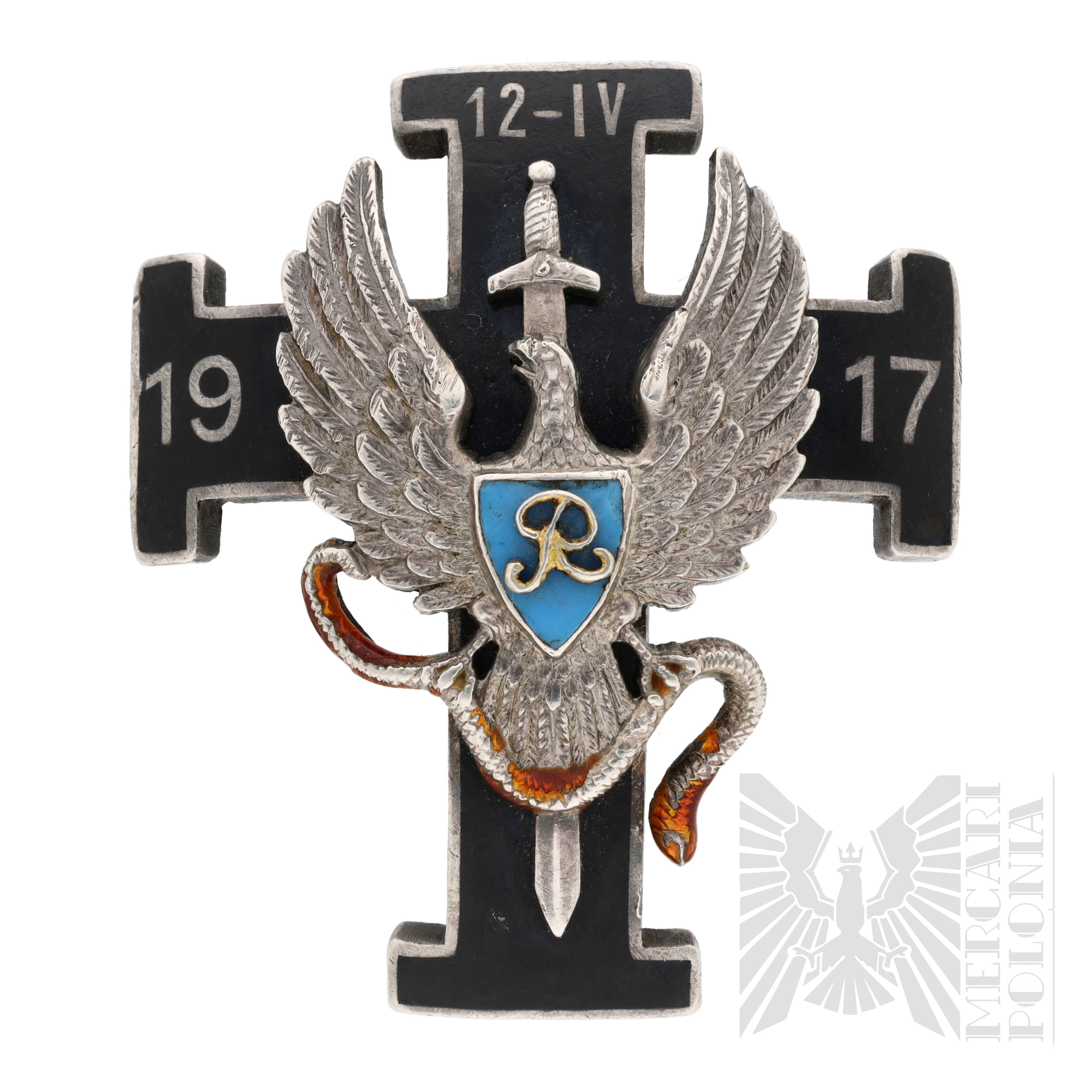 Odznaka w formie krzyża stylizowanego, emaliowanego na czarno, na poziomych ramionach widoczna data 1917 a u szczytu prawego ramienia 12 - IV. Pośrodku widoczny orzeł trzymający w szponach węża.