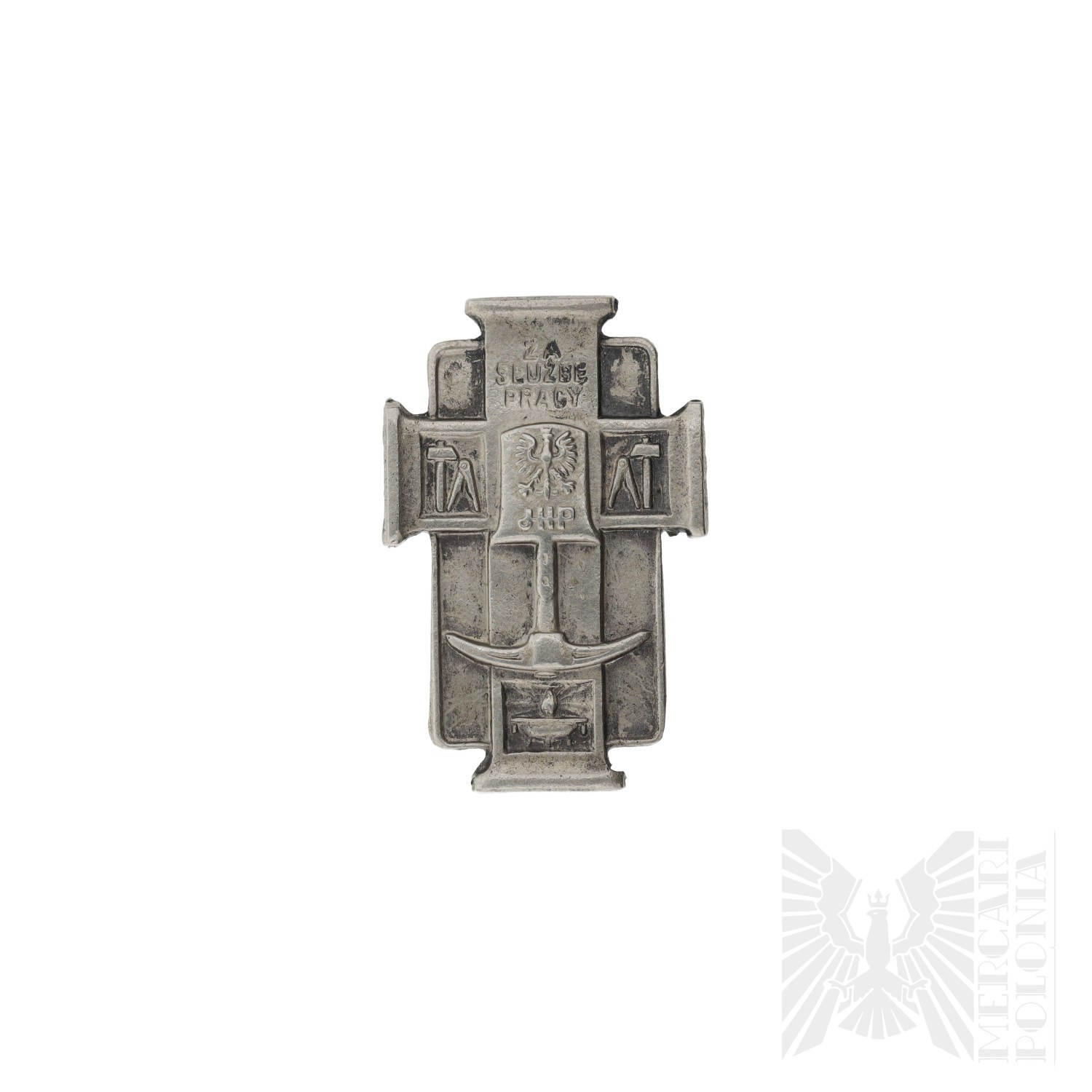 Odznaka przedstawia krzyż umieszczony na tle prostokątnej tarczy. W centrum widnieje orzeł oraz litery „JHP”, powyżej znajduje się napis „ZA SŁUŻBĘ PRACY”, a poniżej – kilof i płonący znicz. Na bocznych ramionach krzyża umieszczono cyrkiel i młot.