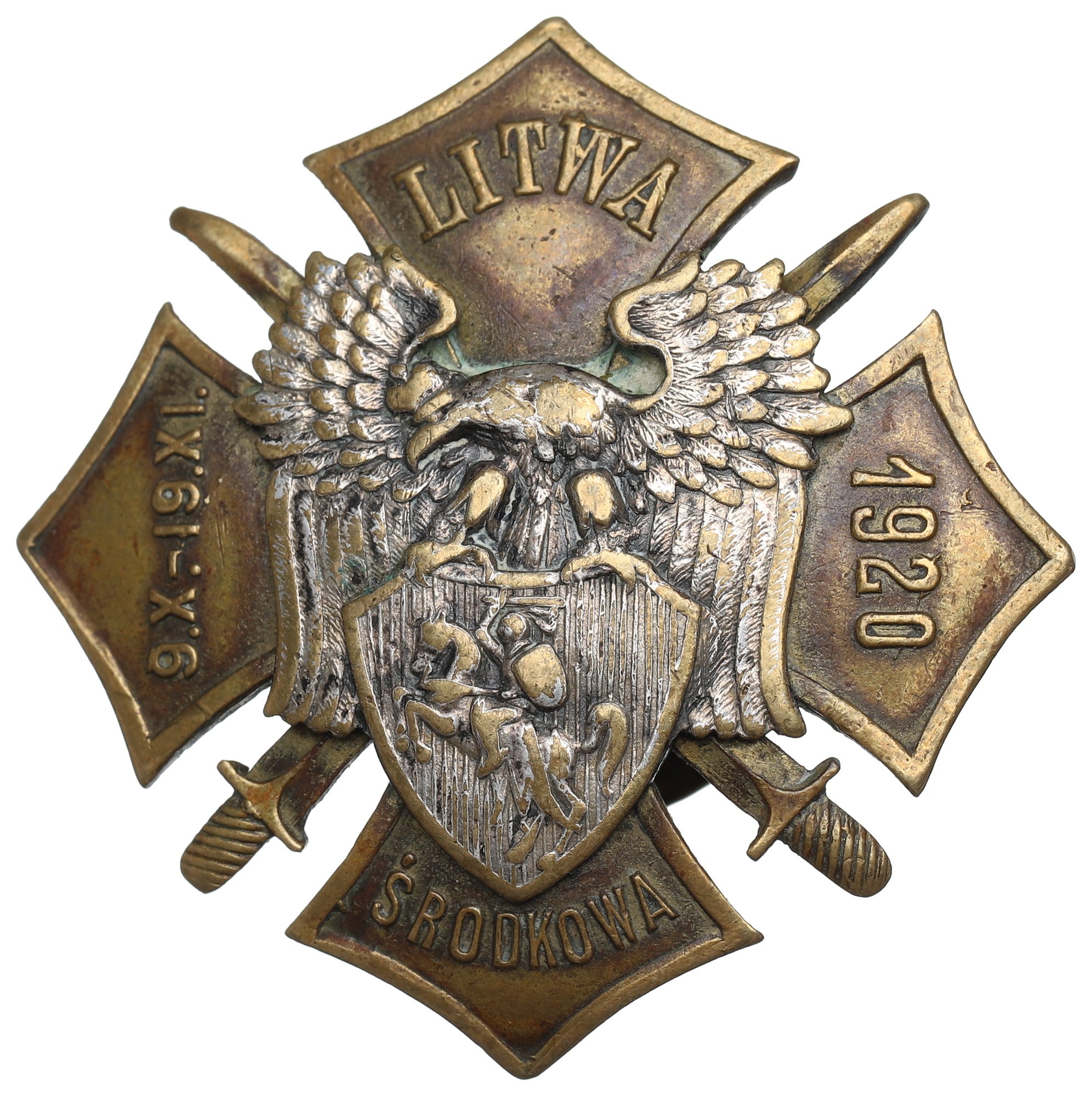 Lico: równoramienny krzyż z napisem na ramionach: LITWA ŚRODKOWA 9.X.-19.XI. 1920, na krzyżu nakładka w postaci godła Litwy Środkowej;