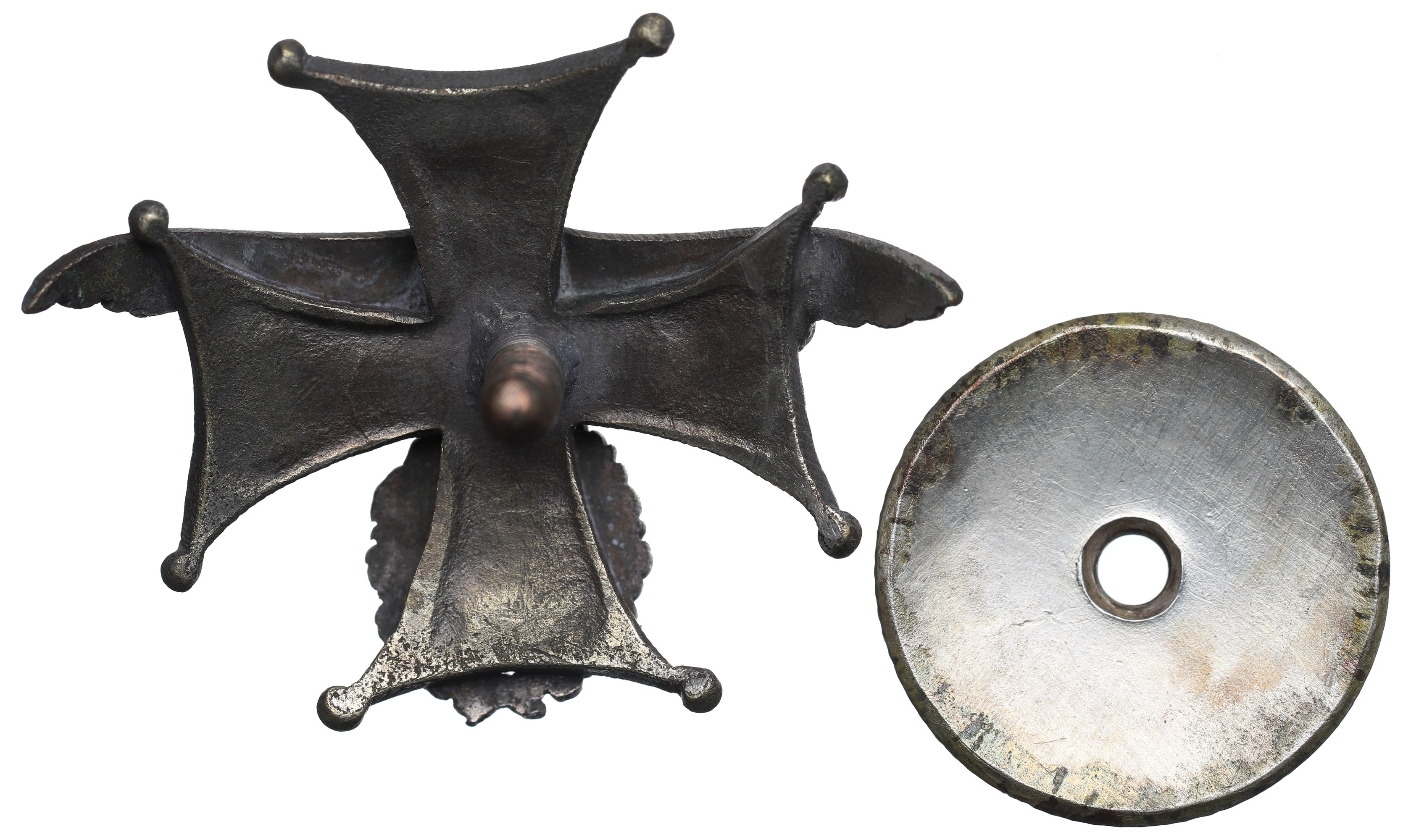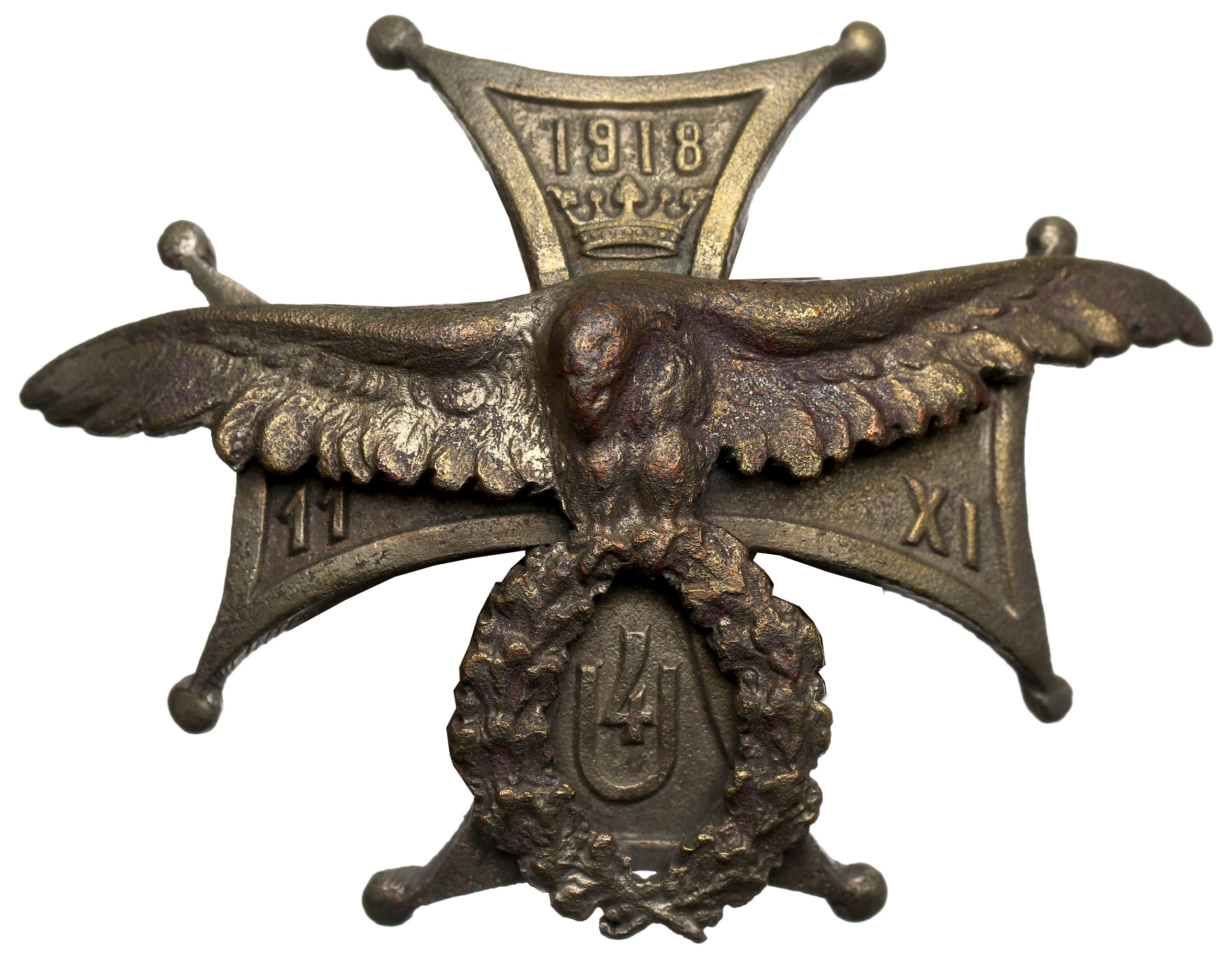 Lico: krzyż o kształcie krzyża Orderu Virtuti Militari, nań nałożony ukoronowany orzeł trzymający w szponach wieniec okalający cyfrę pułku 4U; w ramionach krzyża data 11-XI/1918;