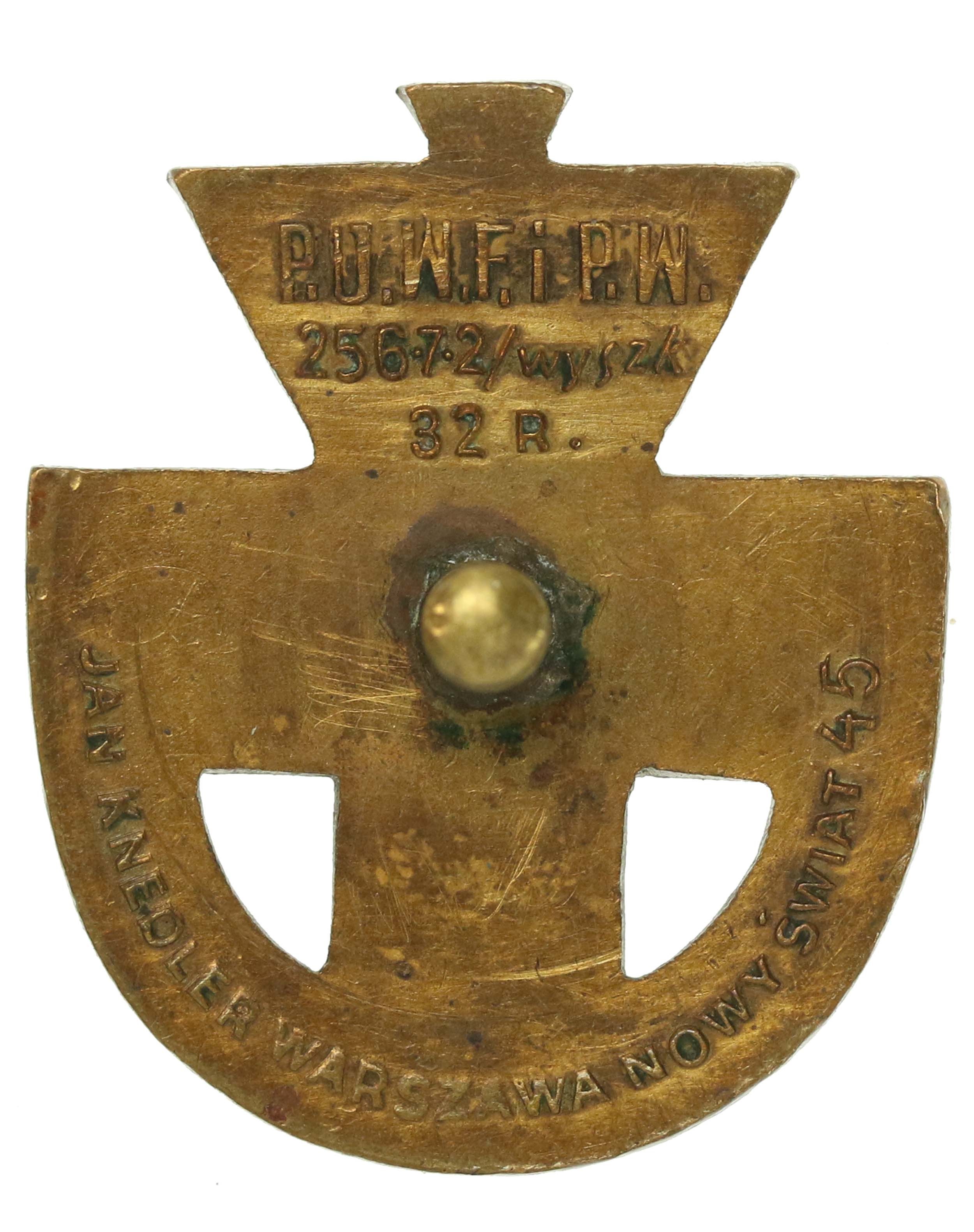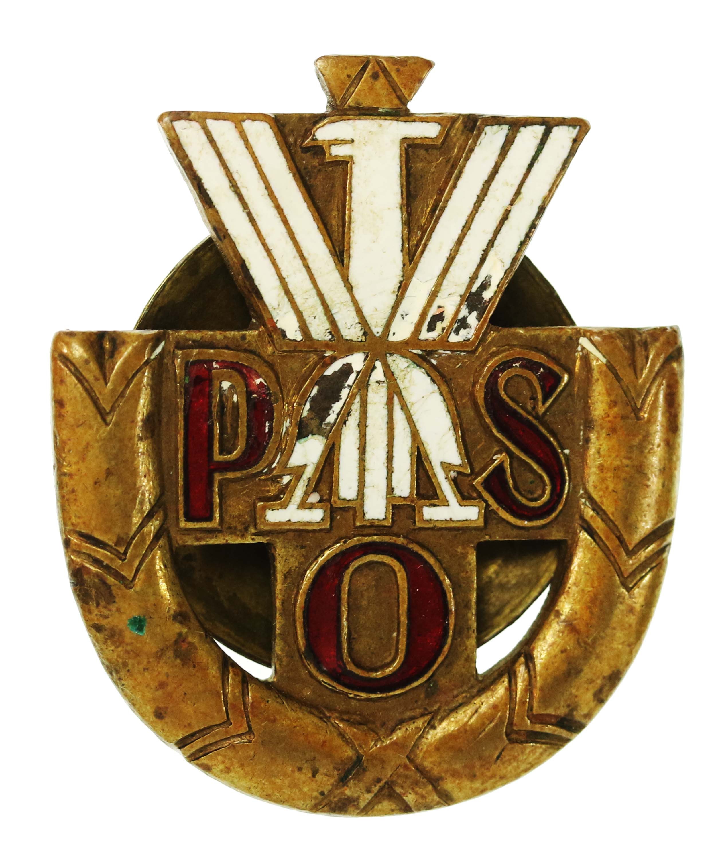 II RP, Złota Odznaka POS. Knedler. Wym. 32 x 27 mm. Nakrętka niesygnowana. Średnica nakrętki 21 mm. Występują ubytki emalii. Stan zachowania dobry.